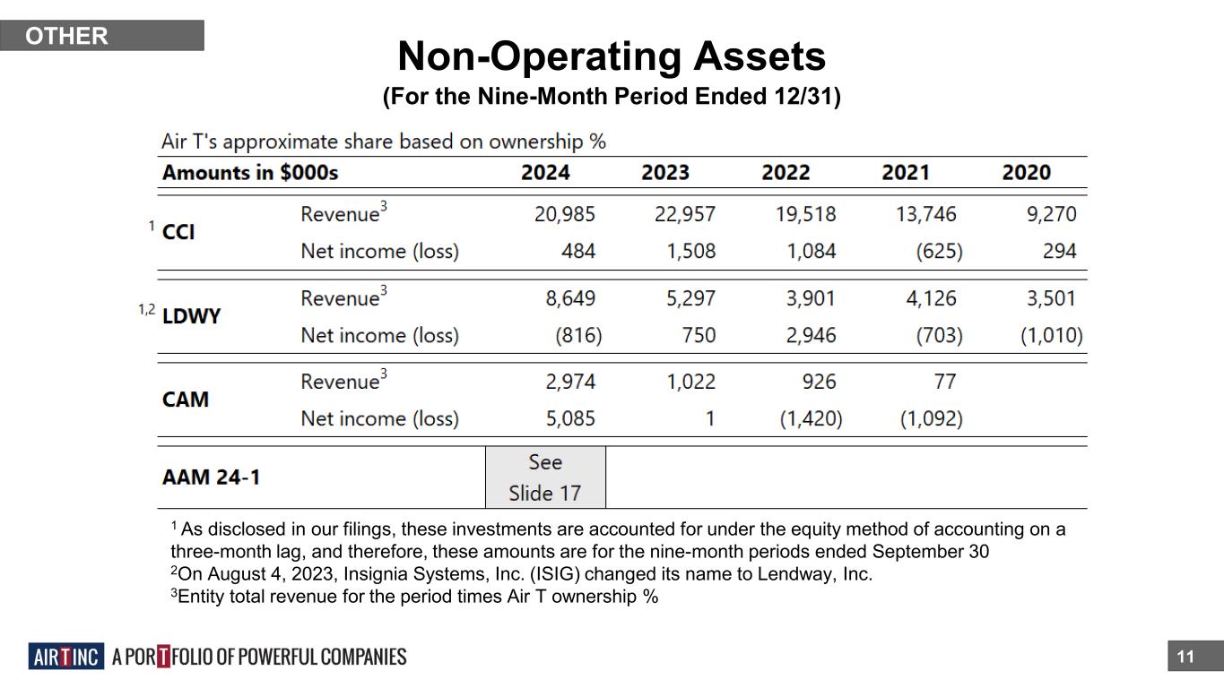 Non-Operating Assets 11 OTHER (For the Nine-Month Period Ended 12/31) 1 As disclosed in our filings, these investments are accounted for under the equity method of accounting on a three-month lag, and therefore, these amounts are for the nine-month periods ended September 30 2On August 4, 2023, Insignia Systems, Inc. (ISIG) changed its name to Lendway, Inc. 3Entity total revenue for the period times Air T ownership %