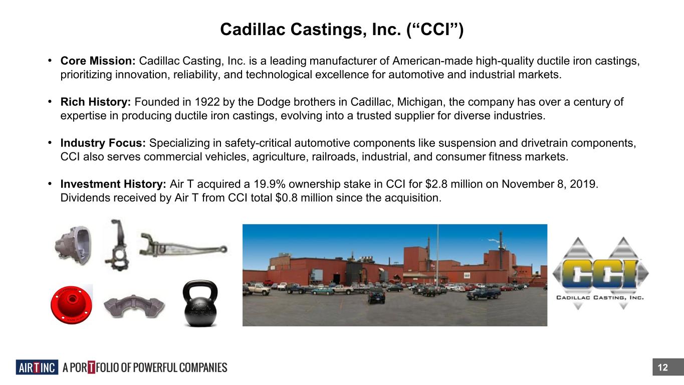 Cadillac Castings, Inc. (“CCI”) 12 • Core Mission: Cadillac Casting, Inc. is a leading manufacturer of American-made high-quality ductile iron castings, prioritizing innovation, reliability, and technological excellence for automotive and industrial markets. • Rich History: Founded in 1922 by the Dodge brothers in Cadillac, Michigan, the company has over a century of expertise in producing ductile iron castings, evolving into a trusted supplier for diverse industries. • Industry Focus: Specializing in safety-critical automotive components like suspension and drivetrain components, CCI also serves commercial vehicles, agriculture, railroads, industrial, and consumer fitness markets. • Investment History: Air T acquired a 19.9% ownership stake in CCI for $2.8 million on November 8, 2019. Dividends received by Air T from CCI total $0.8 million since the acquisition.