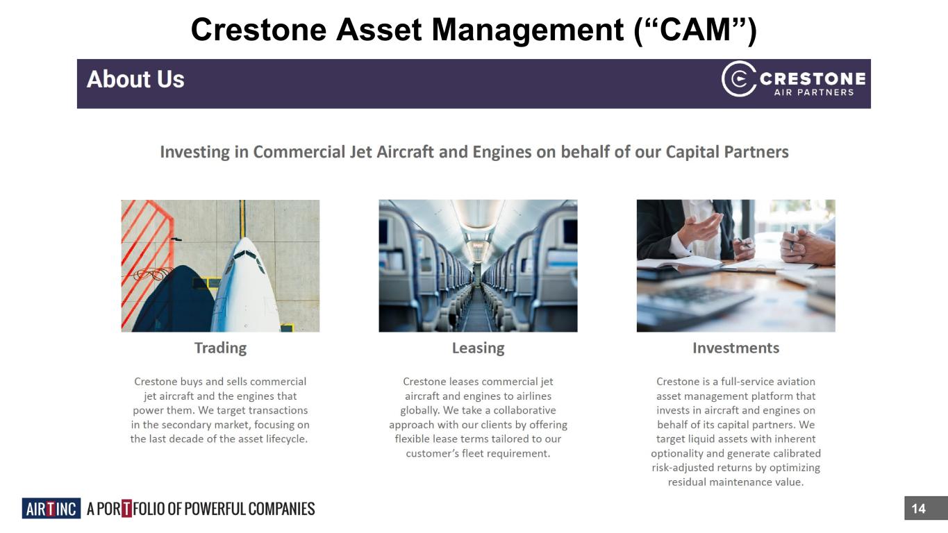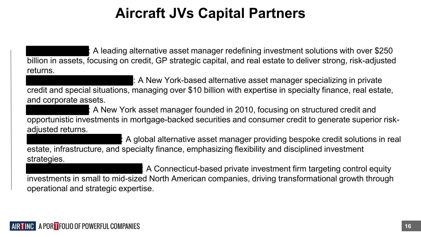 16 xxxxxxxxxxxxxxx: A leading alternative asset manager redefining investment solutions with over $250 billion in assets, focusing on credit, GP strategic capital, and real estate to deliver strong, risk-adjusted returns. xxxxxxxxxxxxxxxxxxxxxxxxxx: A New York-based alternative asset manager specializing in private credit and special situations, managing over $10 billion with expertise in specialty finance, real estate, and corporate assets. xxxxxxxxxxxxxxx: A New York asset manager founded in 2010, focusing on structured credit and opportunistic investments in mortgage-backed securities and consumer credit to generate superior risk- adjusted returns. xxxxxxxxxxxxxxxxxxxxxxx: A global alternative asset manager providing bespoke credit solutions in real estate, infrastructure, and specialty finance, emphasizing flexibility and disciplined investment strategies. xxxxxxxxxxxxxxxxxxxxxxxxxxxx: A Connecticut-based private investment firm targeting control equity investments in small to mid-sized North American companies, driving transformational growth through operational and strategic expertise. Aircraft JVs Capital Partners