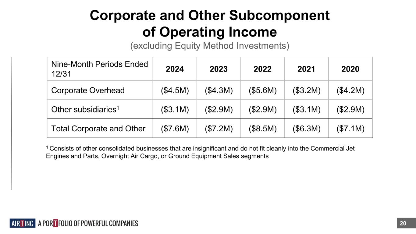 20 Nine-Month Periods Ended 12/31 2024 2023 2022 2021 2020 Corporate Overhead ($4.5M) ($4.3M) ($5.6M) ($3.2M) ($4.2M) Other subsidiaries1 ($3.1M) ($2.9M) ($2.9M) ($3.1M) ($2.9M) Total Corporate and Other ($7.6M) ($7.2M) ($8.5M) ($6.3M) ($7.1M) Corporate and Other Subcomponent of Operating Income (excluding Equity Method Investments) 1 Consists of other consolidated businesses that are insignificant and do not fit cleanly into the Commercial Jet Engines and Parts, Overnight Air Cargo, or Ground Equipment Sales segments