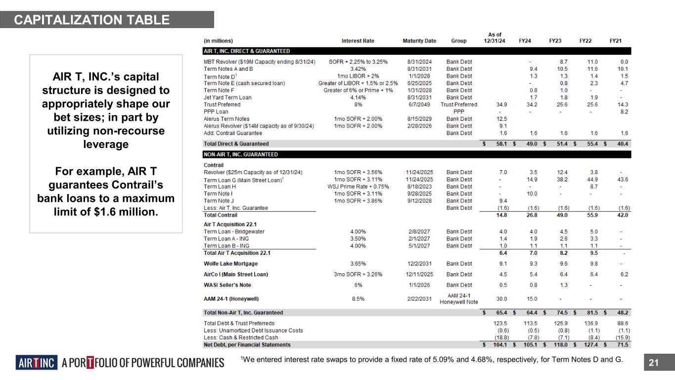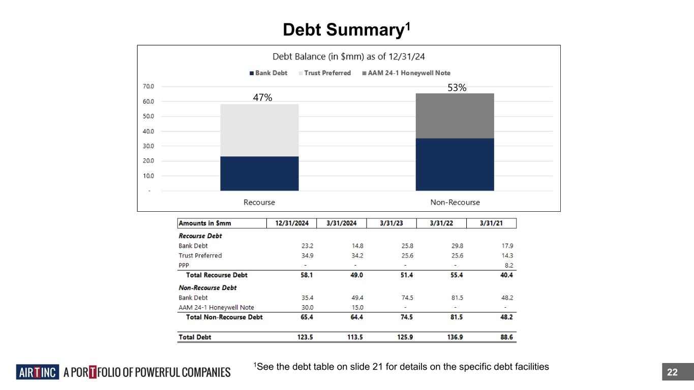 21 CAPITALIZATION TABLE AIR T, INC.’s capital structure is designed to appropriately shape our bet sizes; in part by utilizing non-recourse leverage For example, AIR T guarantees Contrail’s bank loans to a maximum limit of $1.6 million. 1We entered interest rate swaps to provide a fixed rate of 5.09% and 4.68%, respectively, for Term Notes D and G.