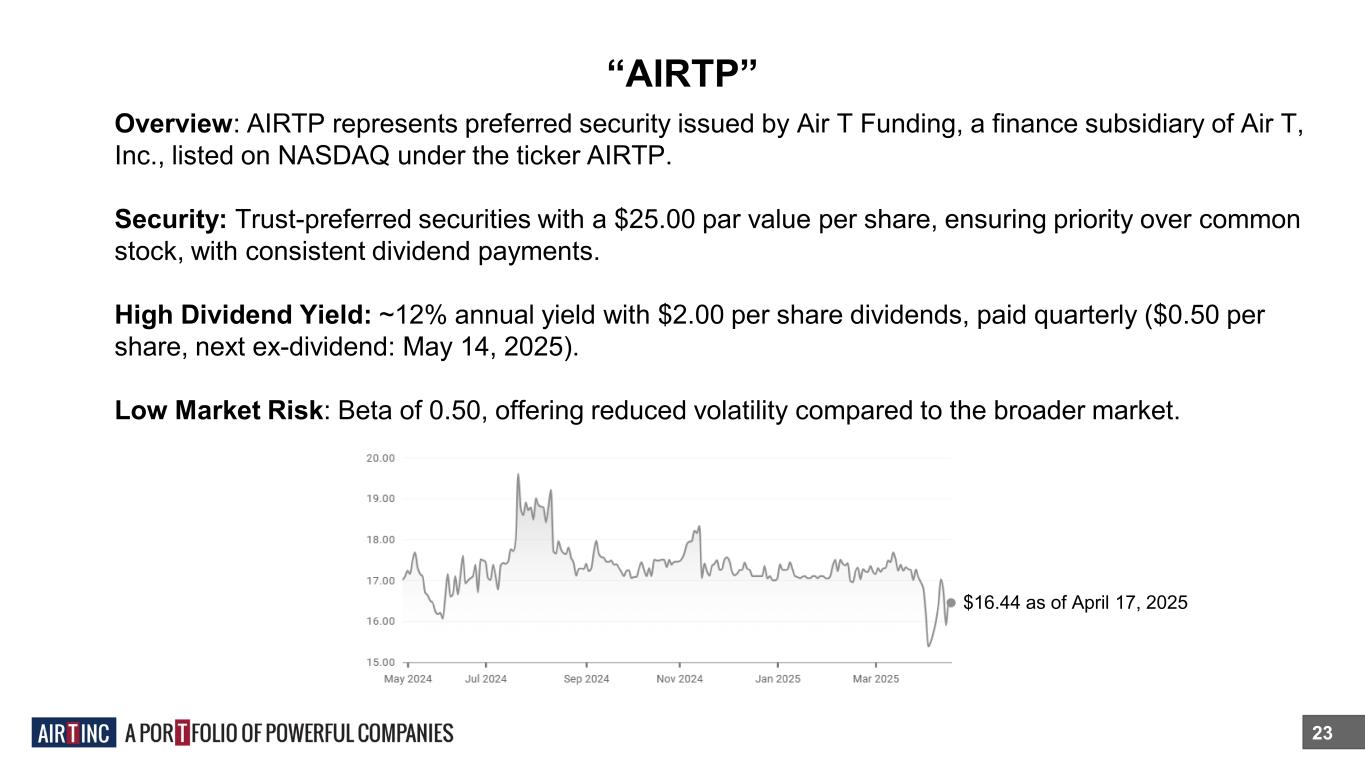 “AIRTP” 23 Overview: AIRTP represents preferred security issued by Air T Funding, a finance subsidiary of Air T, Inc., listed on NASDAQ under the ticker AIRTP. Security: Trust-preferred securities with a $25.00 par value per share, ensuring priority over common stock, with consistent dividend payments. High Dividend Yield: ~12% annual yield with $2.00 per share dividends, paid quarterly ($0.50 per share, next ex-dividend: May 14, 2025). Low Market Risk: Beta of 0.50, offering reduced volatility compared to the broader market. $16.44 as of April 17, 2025