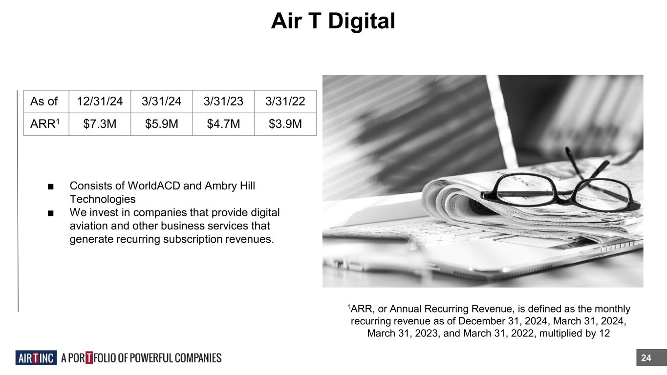 Air T Digital 24 ■ Consists of WorldACD and Ambry Hill Technologies ■ We invest in companies that provide digital aviation and other business services that generate recurring subscription revenues. As of 12/31/24 3/31/24 3/31/23 3/31/22 ARR1 $7.3M $5.9M $4.7M $3.9M 1ARR, or Annual Recurring Revenue, is defined as the monthly recurring revenue as of December 31, 2024, March 31, 2024, March 31, 2023, and March 31, 2022, multiplied by 12
