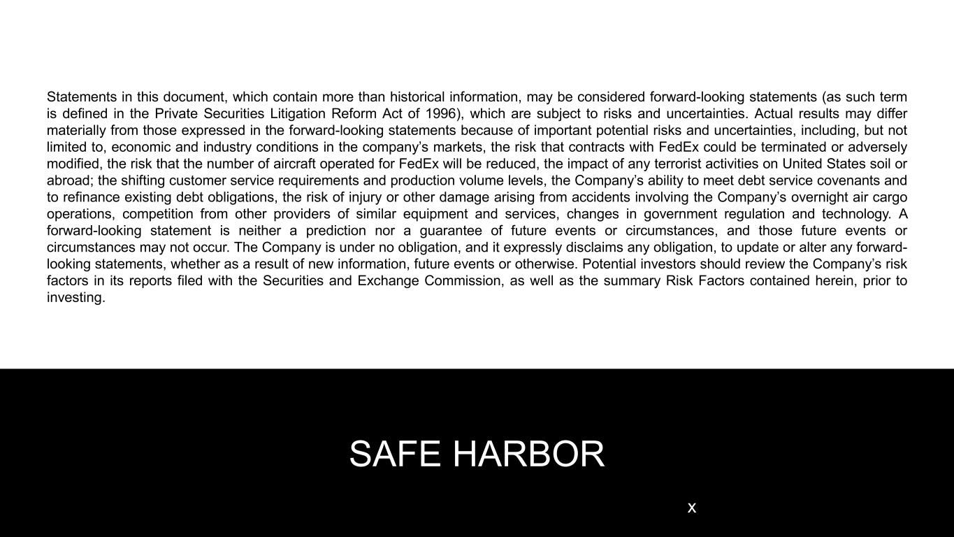 SAFE HARBOR x Statements in this document, which contain more than historical information, may be considered forward-looking statements (as such term is defined in the Private Securities Litigation Reform Act of 1996), which are subject to risks and uncertainties. Actual results may differ materially from those expressed in the forward-looking statements because of important potential risks and uncertainties, including, but not limited to, economic and industry conditions in the company’s markets, the risk that contracts with FedEx could be terminated or adversely modified, the risk that the number of aircraft operated for FedEx will be reduced, the impact of any terrorist activities on United States soil or abroad; the shifting customer service requirements and production volume levels, the Company’s ability to meet debt service covenants and to refinance existing debt obligations, the risk of injury or other damage arising from accidents involving the Company’s overnight air cargo operations, competition from other providers of similar equipment and services, changes in government regulation and technology. A forward-looking statement is neither a prediction nor a guarantee of future events or circumstances, and those future events or circumstances may not occur. The Company is under no obligation, and it expressly disclaims any obligation, to update or alter any forward- looking statements, whether as a result of new information, future events or otherwise. Potential investors should review the Company’s risk factors in its reports filed with the Securities and Exchange Commission, as well as the summary Risk Factors contained herein, prior to investing.