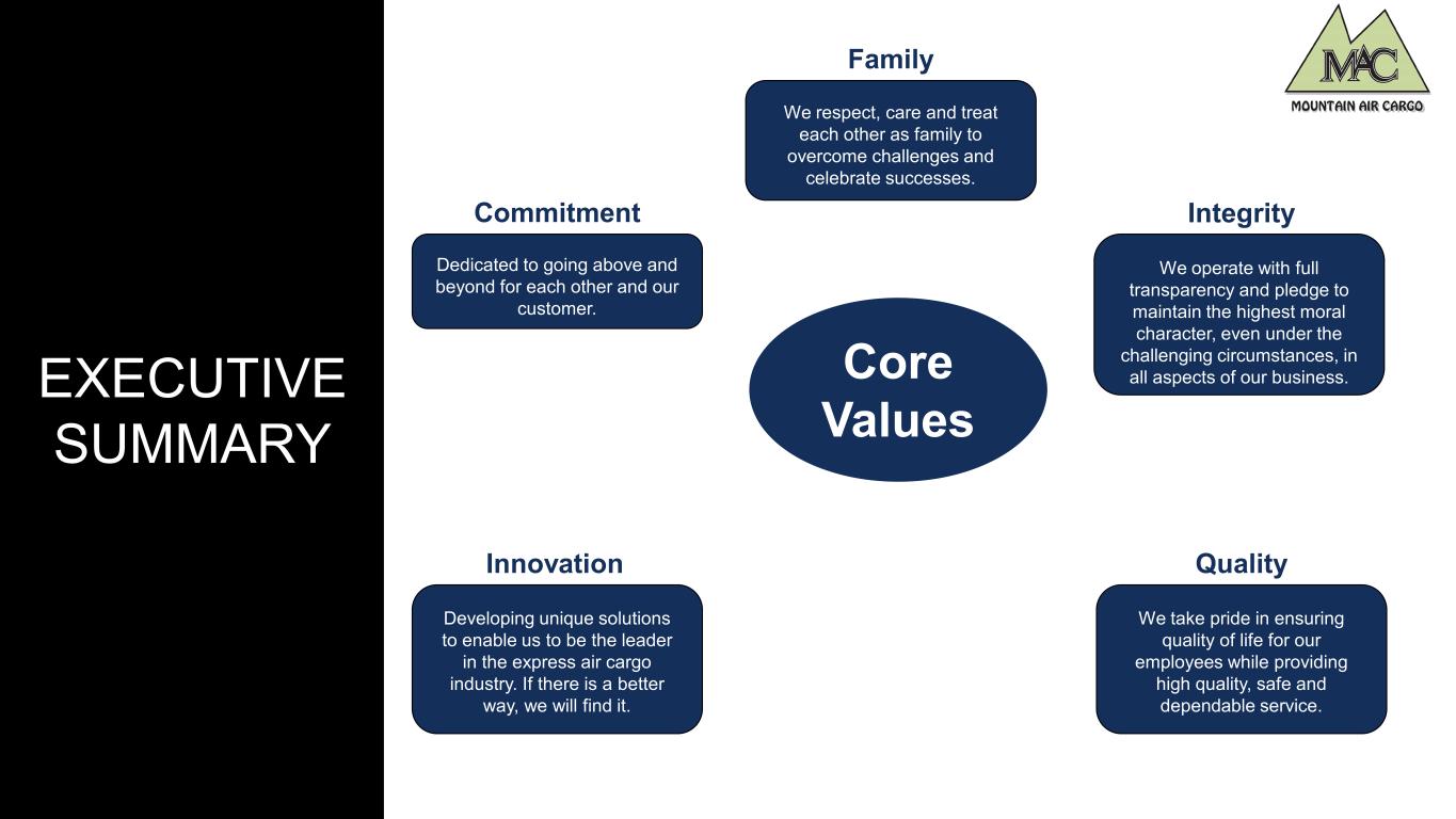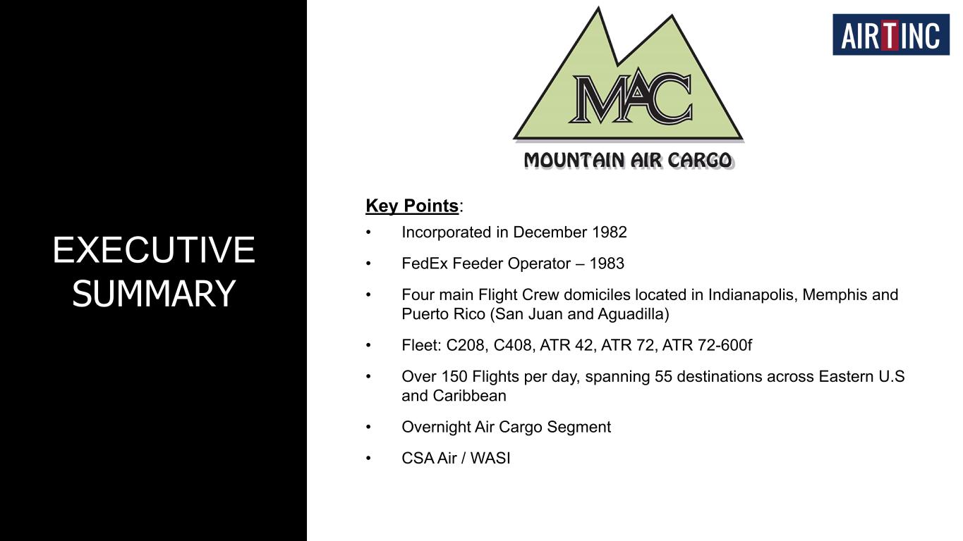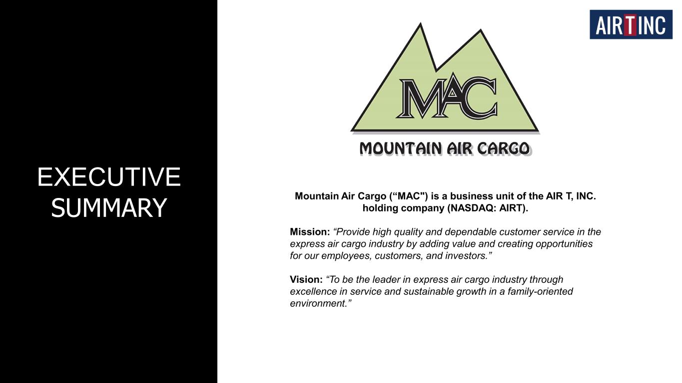 EXECUTIVE SUMMARY x Mountain Air Cargo (“MAC") is a business unit of the AIR T, INC. holding company (NASDAQ: AIRT). Mission: “Provide high quality and dependable customer service in the express air cargo industry by adding value and creating opportunities for our employees, customers, and investors.” Vision: “To be the leader in express air cargo industry through excellence in service and sustainable growth in a family-oriented environment.”