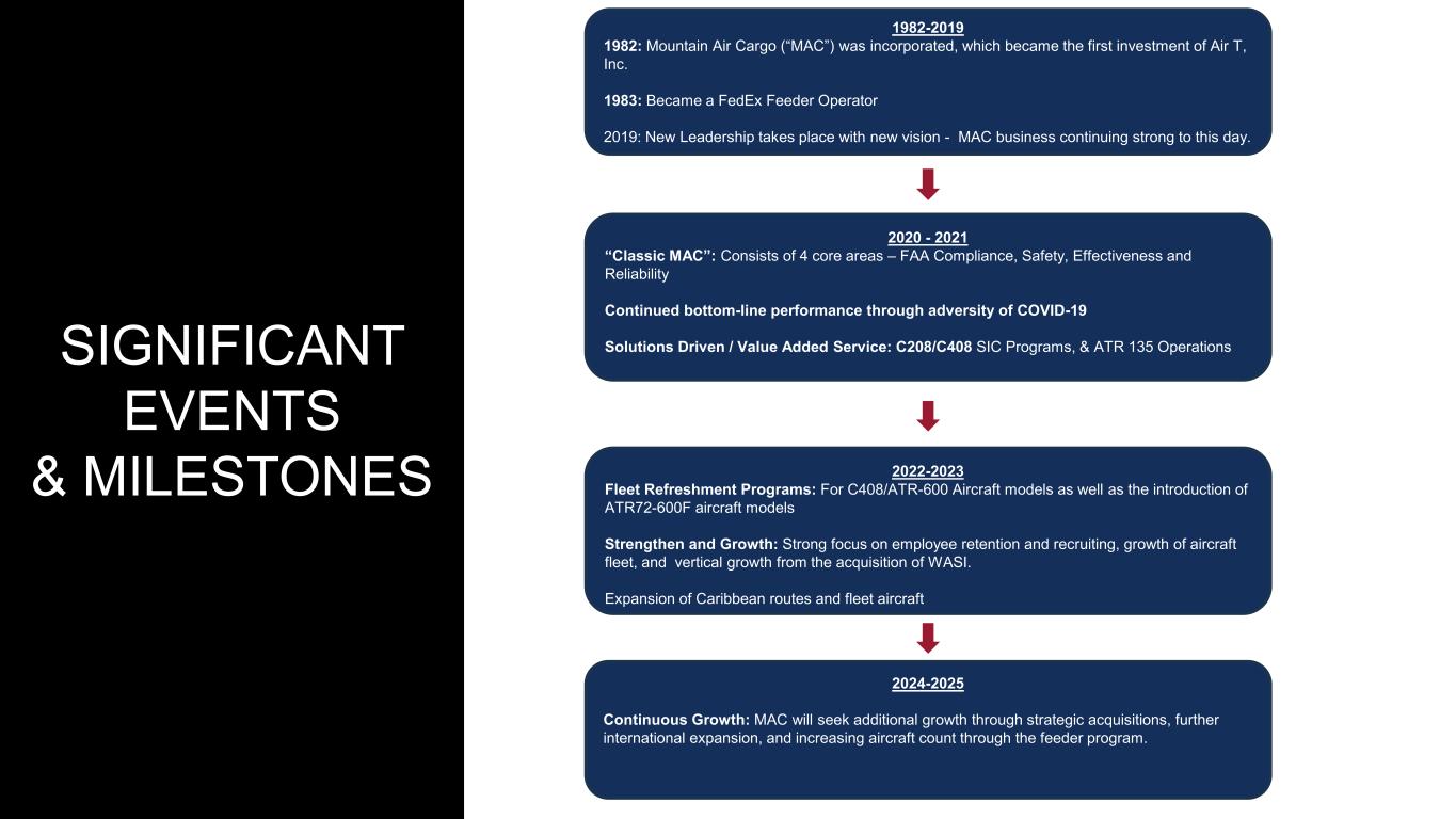 SIGNIFICANT EVENTS & MILESTONES x 1982-2019 1982: Mountain Air Cargo (“MAC”) was incorporated, which became the first investment of Air T, Inc. 1983: Became a FedEx Feeder Operator 2019: New Leadership takes place with new vision - MAC business continuing strong to this day. 2020 - 2021 “Classic MAC”: Consists of 4 core areas – FAA Compliance, Safety, Effectiveness and Reliability Continued bottom-line performance through adversity of COVID-19 Solutions Driven / Value Added Service: C208/C408 SIC Programs, & ATR 135 Operations 2022-2023 Fleet Refreshment Programs: For C408/ATR-600 Aircraft models as well as the introduction of ATR72-600F aircraft models Strengthen and Growth: Strong focus on employee retention and recruiting, growth of aircraft fleet, and vertical growth from the acquisition of WASI. Expansion of Caribbean routes and fleet aircraft 2024-2025 Continuous Growth: MAC will seek additional growth through strategic acquisitions, further international expansion, and increasing aircraft count through the feeder program.