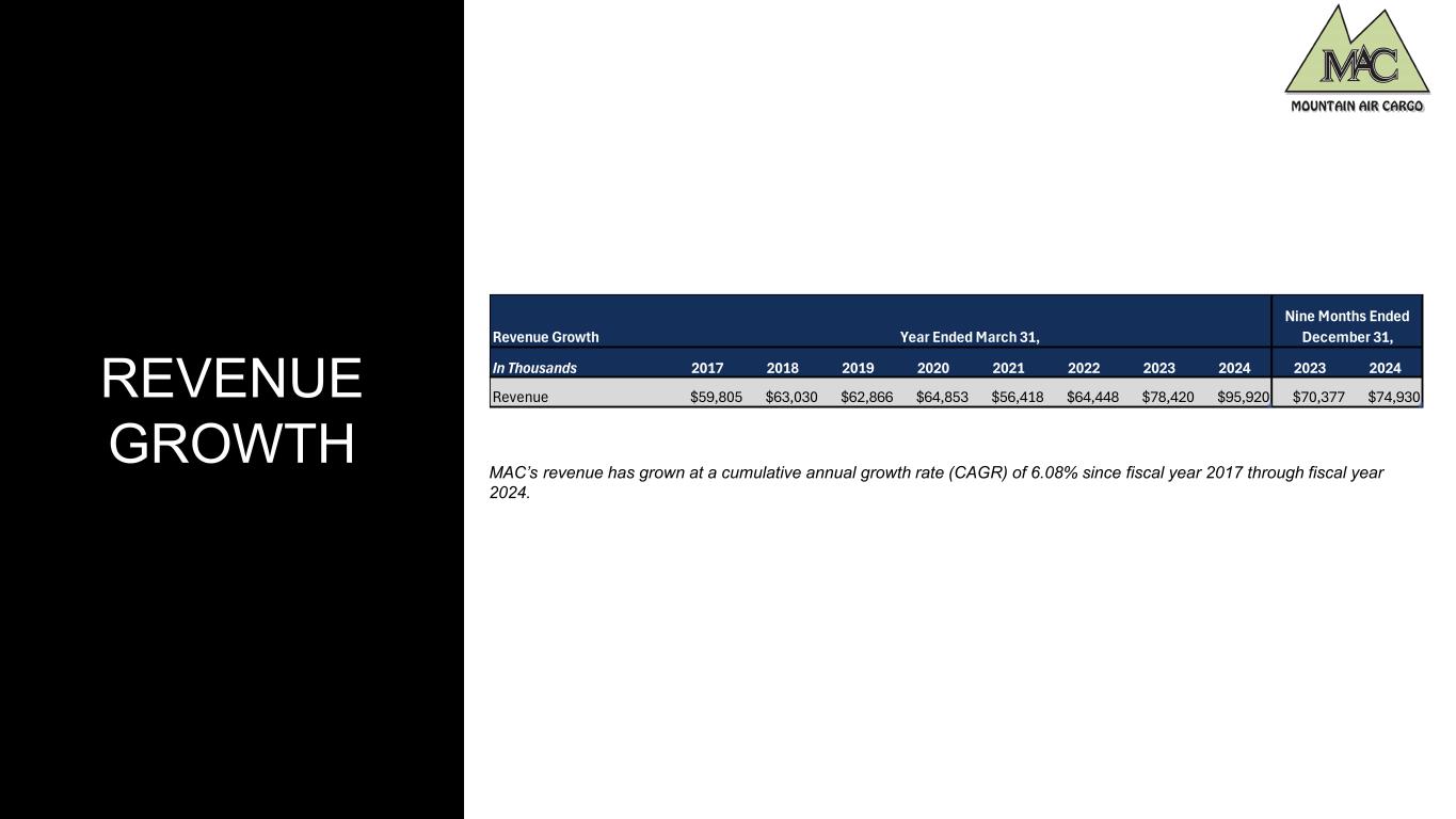 REVENUE GROWTH MAC’s revenue has grown at a cumulative annual growth rate (CAGR) of 6.08% since fiscal year 2017 through fiscal year 2024. Revenue Growth In Thousands 2017 2018 2019 2020 2021 2022 2023 2024 2023 2024 Revenue $59,805 $63,030 $62,866 $64,853 $56,418 $64,448 $78,420 $95,920 $70,377 $74,930 Year Ended March 31, Nine Months Ended December 31,