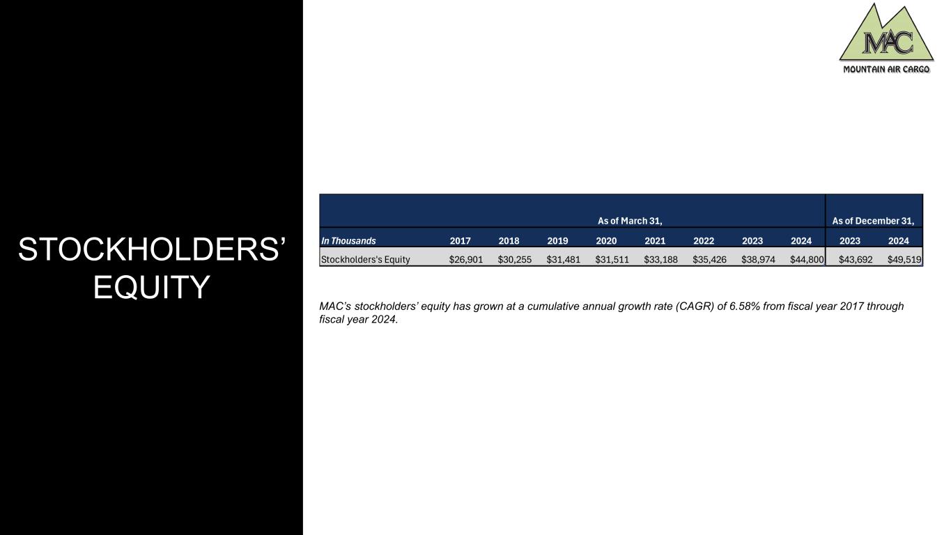 STOCKHOLDERS’ EQUITY MAC’s stockholders’ equity has grown at a cumulative annual growth rate (CAGR) of 6.58% from fiscal year 2017 through fiscal year 2024. In Thousands 2017 2018 2019 2020 2021 2022 2023 2024 2023 2024 Stockholders's Equity $26,901 $30,255 $31,481 $31,511 $33,188 $35,426 $38,974 $44,800 $43,692 $49,519 As of March 31, As of December 31,