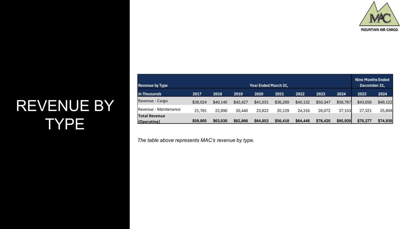 REVENUE BY TYPE The table above represents MAC’s revenue by type. Revenue by Type In Thousands 2017 2018 2019 2020 2021 2022 2023 2024 2023 2024 Revenue - Cargo $38,024 $40,140 $42,427 $41,031 $36,289 $40,132 $50,347 $58,767 $43,056 $49,122 Revenue - Maintenance 21,781 22,890 20,440 23,822 20,129 24,316 28,072 37,153 27,321 25,809 Total Revenue (Operating) $59,805 $63,030 $62,866 $64,853 $56,418 $64,448 $78,420 $95,920 $70,377 $74,930 Year Ended March 31, Nine Months Ended December 31,