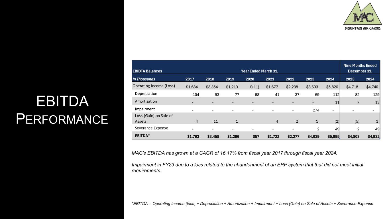 EBITDA PERFORMANCE MAC’s EBITDA has grown at a CAGR of 16.17% from fiscal year 2017 through fiscal year 2024. Impairment in FY23 due to a loss related to the abandonment of an ERP system that that did not meet initial requirements. *EBITDA = Operating Income (loss) + Depreciation + Amortization + Impairment + Loss (Gain) on Sale of Assets + Severance Expense EBIDTA Balances In Thousands 2017 2018 2019 2020 2021 2022 2023 2024 2023 2024 Operating Income (Loss) $1,684 $3,354 $1,219 $(11) $1,677 $2,238 $3,693 $5,826 $4,718 $4,740 Depreciation 104 93 77 68 41 37 69 112 82 129 Amortization - - - - - - - 11 7 13 Impairment - - - - - - 274 - - - Loss (Gain) on Sale of Assets 4 11 1 4 2 1 (2) (5) 1 Severance Expense - - - - - - 2 49 2 49 EBITDA* $1,793 $3,458 $1,296 $57 $1,722 $2,277 $4,039 $5,995 $4,803 $4,932 Year Ended March 31, Nine Months Ended December 31,