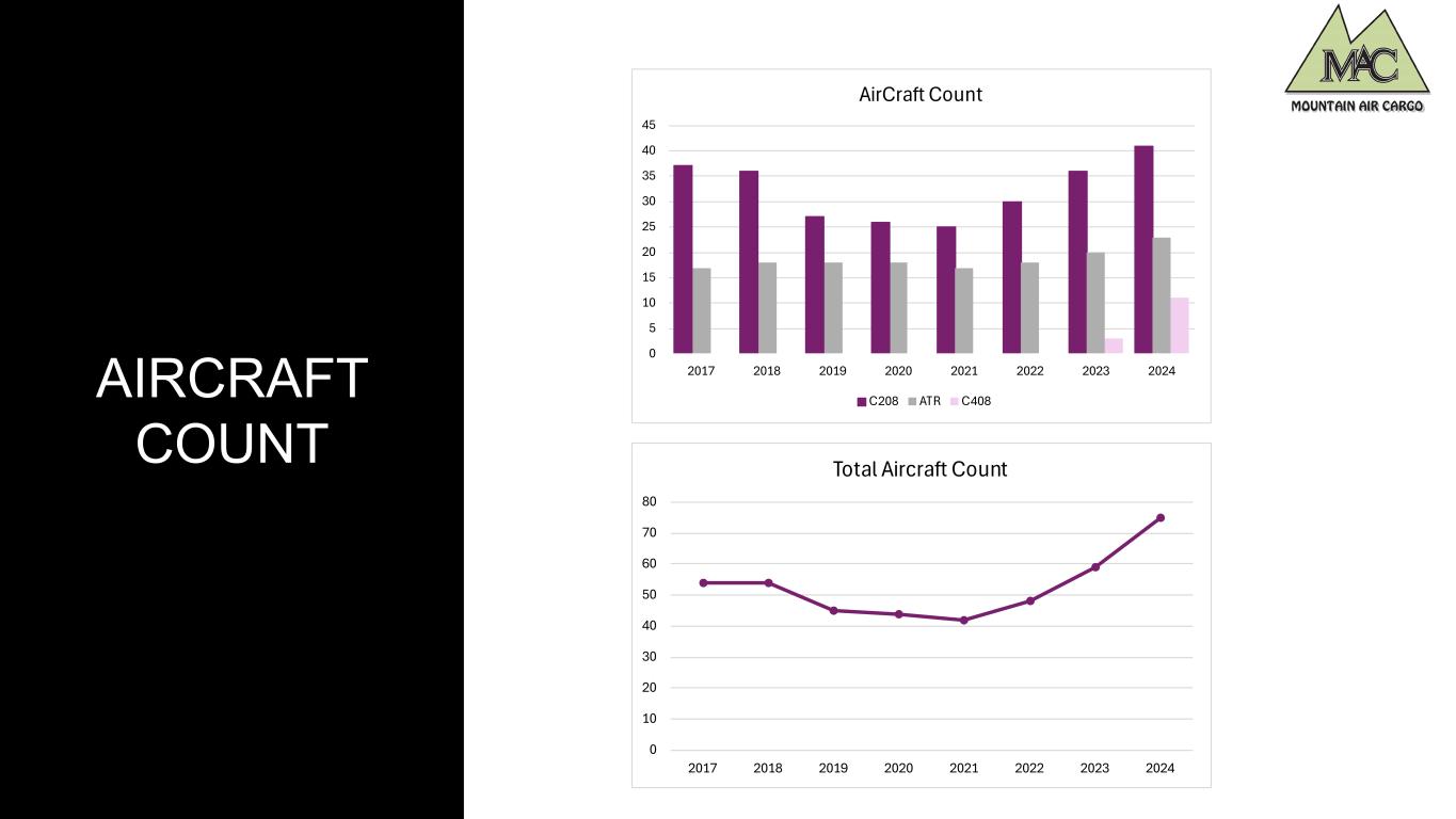 AIRCRAFT COUNT 0 5 10 15 20 25 30 35 40 45 2017 2018 2019 2020 2021 2022 2023 2024 AirCraft Count C208 ATR C408 0 10 20 30 40 50 60 70 80 2017 2018 2019 2020 2021 2022 2023 2024 Total Aircraft Count