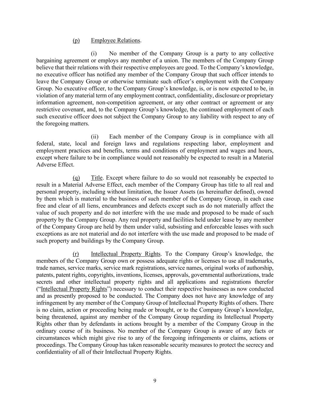 9 (p) Employee Relations. (i) No member of the Company Group is a party to any collective bargaining agreement or employs any member of a union. The members of the Company Group believe that their relations with their respective employees are good. To the Company’s knowledge, no executive officer has notified any member of the Company Group that such officer intends to leave the Company Group or otherwise terminate such officer’s employment with the Company Group. No executive officer, to the Company Group’s knowledge, is, or is now expected to be, in violation of any material term of any employment contract, confidentiality, disclosure or proprietary information agreement, non-competition agreement, or any other contract or agreement or any restrictive covenant, and, to the Company Group’s knowledge, the continued employment of each such executive officer does not subject the Company Group to any liability with respect to any of the foregoing matters. (ii) Each member of the Company Group is in compliance with all federal, state, local and foreign laws and regulations respecting labor, employment and employment practices and benefits, terms and conditions of employment and wages and hours, except where failure to be in compliance would not reasonably be expected to result in a Material Adverse Effect. (q) Title. Except where failure to do so would not reasonably be expected to result in a Material Adverse Effect, each member of the Company Group has title to all real and personal property, including without limitation, the Issuer Assets (as hereinafter defined), owned by them which is material to the business of such member of the Company Group, in each case free and clear of all liens, encumbrances and defects except such as do not materially affect the value of such property and do not interfere with the use made and proposed to be made of such property by the Company Group. Any real property and facilities held under lease by any member of the Company Group are held by them under valid, subsisting and enforceable leases with such exceptions as are not material and do not interfere with the use made and proposed to be made of such property and buildings by the Company Group. (r) Intellectual Property Rights. To the Company Group’s knowledge, the members of the Company Group own or possess adequate rights or licenses to use all trademarks, trade names, service marks, service mark registrations, service names, original works of authorship, patents, patent rights, copyrights, inventions, licenses, approvals, governmental authorizations, trade secrets and other intellectual property rights and all applications and registrations therefor (“Intellectual Property Rights”) necessary to conduct their respective businesses as now conducted and as presently proposed to be conducted. The Company does not have any knowledge of any infringement by any member of the Company Group of Intellectual Property Rights of others. There is no claim, action or proceeding being made or brought, or to the Company Group’s knowledge, being threatened, against any member of the Company Group regarding its Intellectual Property Rights other than by defendants in actions brought by a member of the Company Group in the ordinary course of its business. No member of the Company Group is aware of any facts or circumstances which might give rise to any of the foregoing infringements or claims, actions or proceedings. The Company Group has taken reasonable security measures to protect the secrecy and confidentiality of all of their Intellectual Property Rights.
