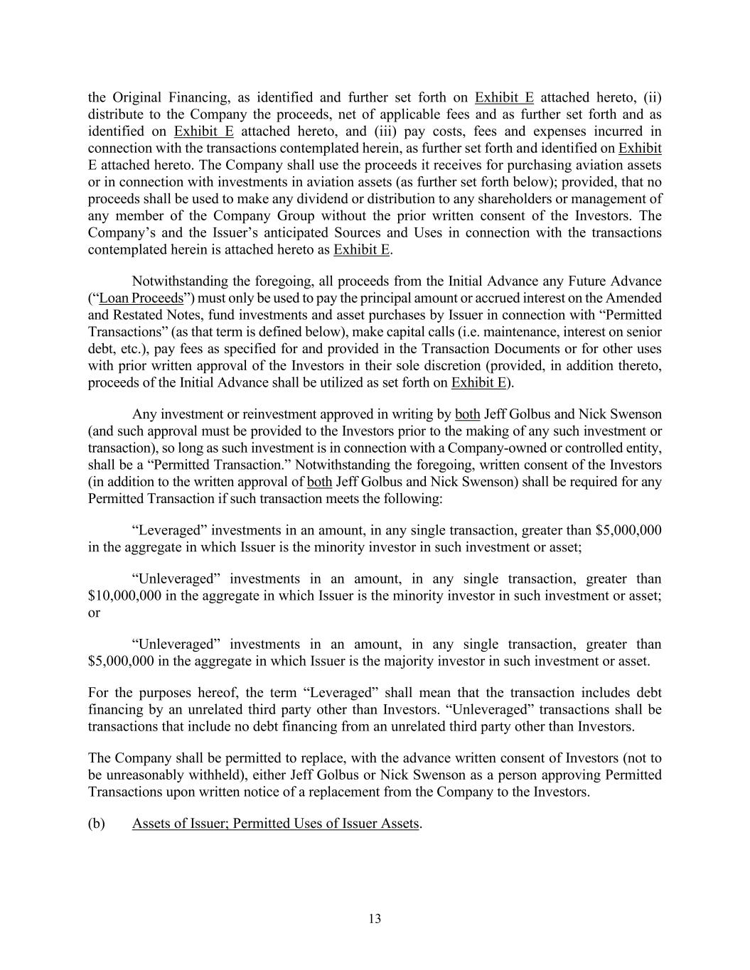 13 the Original Financing, as identified and further set forth on Exhibit E attached hereto, (ii) distribute to the Company the proceeds, net of applicable fees and as further set forth and as identified on Exhibit E attached hereto, and (iii) pay costs, fees and expenses incurred in connection with the transactions contemplated herein, as further set forth and identified on Exhibit E attached hereto. The Company shall use the proceeds it receives for purchasing aviation assets or in connection with investments in aviation assets (as further set forth below); provided, that no proceeds shall be used to make any dividend or distribution to any shareholders or management of any member of the Company Group without the prior written consent of the Investors. The Company’s and the Issuer’s anticipated Sources and Uses in connection with the transactions contemplated herein is attached hereto as Exhibit E. Notwithstanding the foregoing, all proceeds from the Initial Advance any Future Advance (“Loan Proceeds”) must only be used to pay the principal amount or accrued interest on the Amended and Restated Notes, fund investments and asset purchases by Issuer in connection with “Permitted Transactions” (as that term is defined below), make capital calls (i.e. maintenance, interest on senior debt, etc.), pay fees as specified for and provided in the Transaction Documents or for other uses with prior written approval of the Investors in their sole discretion (provided, in addition thereto, proceeds of the Initial Advance shall be utilized as set forth on Exhibit E). Any investment or reinvestment approved in writing by both Jeff Golbus and Nick Swenson (and such approval must be provided to the Investors prior to the making of any such investment or transaction), so long as such investment is in connection with a Company-owned or controlled entity, shall be a “Permitted Transaction.” Notwithstanding the foregoing, written consent of the Investors (in addition to the written approval of both Jeff Golbus and Nick Swenson) shall be required for any Permitted Transaction if such transaction meets the following: “Leveraged” investments in an amount, in any single transaction, greater than $5,000,000 in the aggregate in which Issuer is the minority investor in such investment or asset; “Unleveraged” investments in an amount, in any single transaction, greater than $10,000,000 in the aggregate in which Issuer is the minority investor in such investment or asset; or “Unleveraged” investments in an amount, in any single transaction, greater than $5,000,000 in the aggregate in which Issuer is the majority investor in such investment or asset. For the purposes hereof, the term “Leveraged” shall mean that the transaction includes debt financing by an unrelated third party other than Investors. “Unleveraged” transactions shall be transactions that include no debt financing from an unrelated third party other than Investors. The Company shall be permitted to replace, with the advance written consent of Investors (not to be unreasonably withheld), either Jeff Golbus or Nick Swenson as a person approving Permitted Transactions upon written notice of a replacement from the Company to the Investors. (b) Assets of Issuer; Permitted Uses of Issuer Assets.
