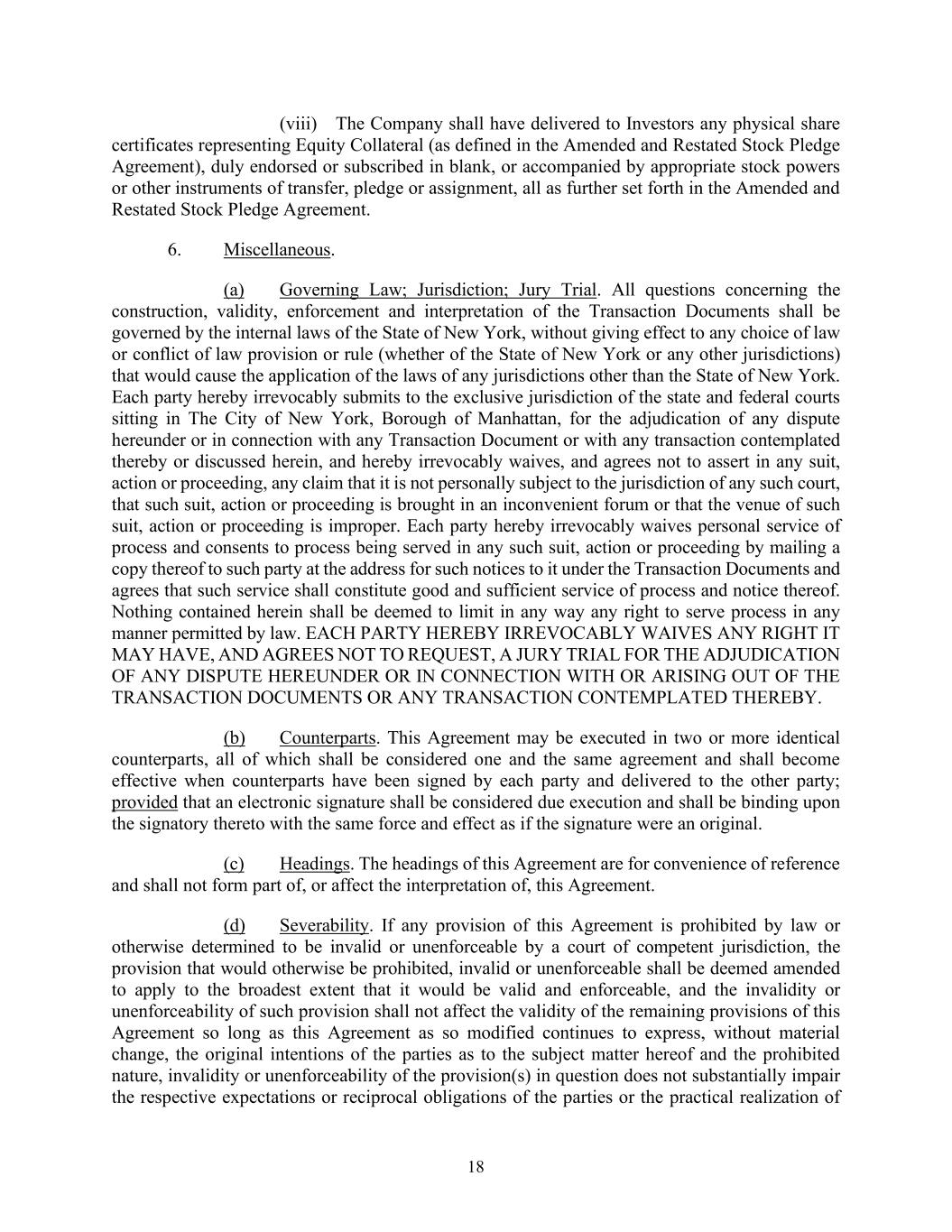 18 (viii) The Company shall have delivered to Investors any physical share certificates representing Equity Collateral (as defined in the Amended and Restated Stock Pledge Agreement), duly endorsed or subscribed in blank, or accompanied by appropriate stock powers or other instruments of transfer, pledge or assignment, all as further set forth in the Amended and Restated Stock Pledge Agreement. 6. Miscellaneous. (a) Governing Law; Jurisdiction; Jury Trial. All questions concerning the construction, validity, enforcement and interpretation of the Transaction Documents shall be governed by the internal laws of the State of New York, without giving effect to any choice of law or conflict of law provision or rule (whether of the State of New York or any other jurisdictions) that would cause the application of the laws of any jurisdictions other than the State of New York. Each party hereby irrevocably submits to the exclusive jurisdiction of the state and federal courts sitting in The City of New York, Borough of Manhattan, for the adjudication of any dispute hereunder or in connection with any Transaction Document or with any transaction contemplated thereby or discussed herein, and hereby irrevocably waives, and agrees not to assert in any suit, action or proceeding, any claim that it is not personally subject to the jurisdiction of any such court, that such suit, action or proceeding is brought in an inconvenient forum or that the venue of such suit, action or proceeding is improper. Each party hereby irrevocably waives personal service of process and consents to process being served in any such suit, action or proceeding by mailing a copy thereof to such party at the address for such notices to it under the Transaction Documents and agrees that such service shall constitute good and sufficient service of process and notice thereof. Nothing contained herein shall be deemed to limit in any way any right to serve process in any manner permitted by law. EACH PARTY HEREBY IRREVOCABLY WAIVES ANY RIGHT IT MAY HAVE, AND AGREES NOT TO REQUEST, A JURY TRIAL FOR THE ADJUDICATION OF ANY DISPUTE HEREUNDER OR IN CONNECTION WITH OR ARISING OUT OF THE TRANSACTION DOCUMENTS OR ANY TRANSACTION CONTEMPLATED THEREBY. (b) Counterparts. This Agreement may be executed in two or more identical counterparts, all of which shall be considered one and the same agreement and shall become effective when counterparts have been signed by each party and delivered to the other party; provided that an electronic signature shall be considered due execution and shall be binding upon the signatory thereto with the same force and effect as if the signature were an original. (c) Headings. The headings of this Agreement are for convenience of reference and shall not form part of, or affect the interpretation of, this Agreement. (d) Severability. If any provision of this Agreement is prohibited by law or otherwise determined to be invalid or unenforceable by a court of competent jurisdiction, the provision that would otherwise be prohibited, invalid or unenforceable shall be deemed amended to apply to the broadest extent that it would be valid and enforceable, and the invalidity or unenforceability of such provision shall not affect the validity of the remaining provisions of this Agreement so long as this Agreement as so modified continues to express, without material change, the original intentions of the parties as to the subject matter hereof and the prohibited nature, invalidity or unenforceability of the provision(s) in question does not substantially impair the respective expectations or reciprocal obligations of the parties or the practical realization of