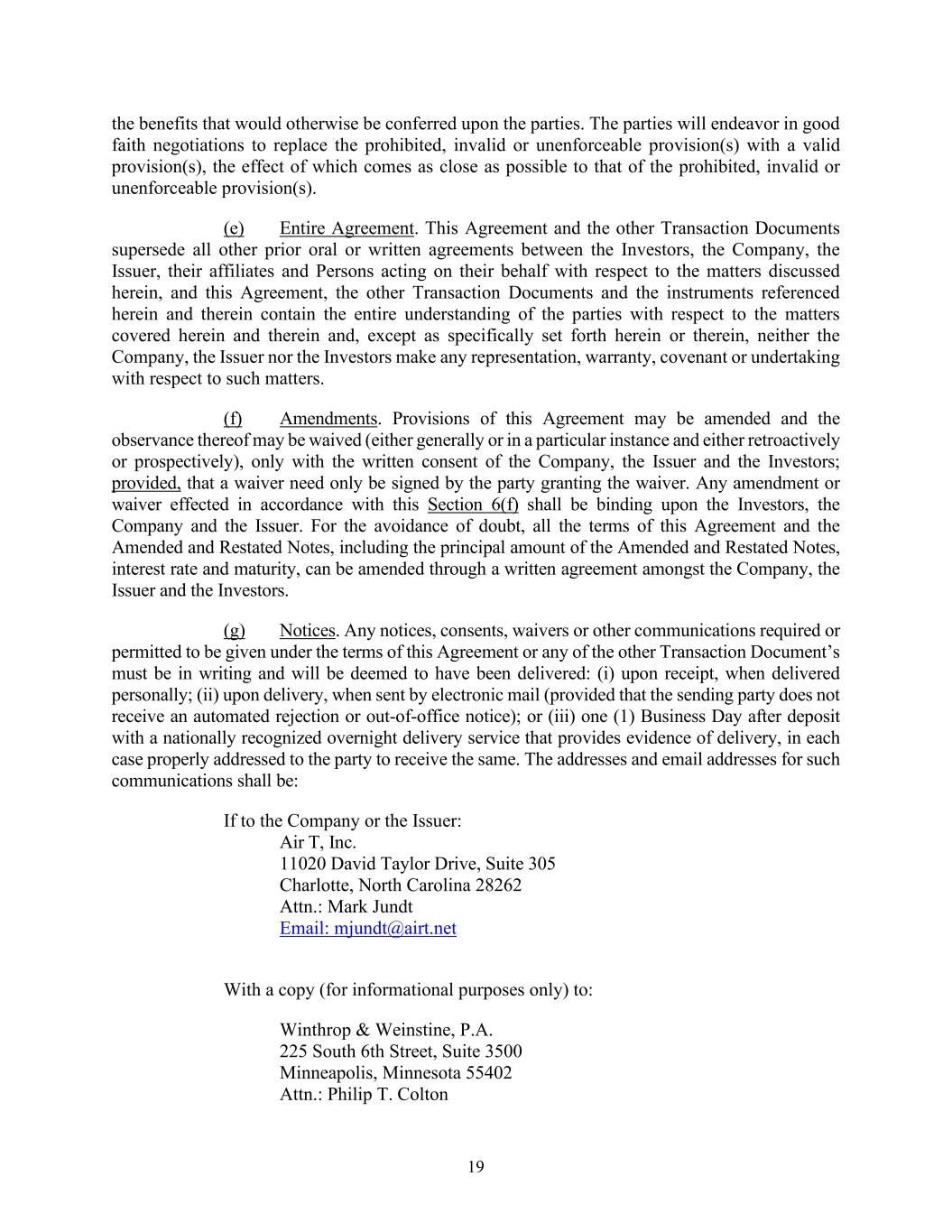 19 the benefits that would otherwise be conferred upon the parties. The parties will endeavor in good faith negotiations to replace the prohibited, invalid or unenforceable provision(s) with a valid provision(s), the effect of which comes as close as possible to that of the prohibited, invalid or unenforceable provision(s). (e) Entire Agreement. This Agreement and the other Transaction Documents supersede all other prior oral or written agreements between the Investors, the Company, the Issuer, their affiliates and Persons acting on their behalf with respect to the matters discussed herein, and this Agreement, the other Transaction Documents and the instruments referenced herein and therein contain the entire understanding of the parties with respect to the matters covered herein and therein and, except as specifically set forth herein or therein, neither the Company, the Issuer nor the Investors make any representation, warranty, covenant or undertaking with respect to such matters. (f) Amendments. Provisions of this Agreement may be amended and the observance thereof may be waived (either generally or in a particular instance and either retroactively or prospectively), only with the written consent of the Company, the Issuer and the Investors; provided, that a waiver need only be signed by the party granting the waiver. Any amendment or waiver effected in accordance with this Section 6(f) shall be binding upon the Investors, the Company and the Issuer. For the avoidance of doubt, all the terms of this Agreement and the Amended and Restated Notes, including the principal amount of the Amended and Restated Notes, interest rate and maturity, can be amended through a written agreement amongst the Company, the Issuer and the Investors. (g) Notices. Any notices, consents, waivers or other communications required or permitted to be given under the terms of this Agreement or any of the other Transaction Document’s must be in writing and will be deemed to have been delivered: (i) upon receipt, when delivered personally; (ii) upon delivery, when sent by electronic mail (provided that the sending party does not receive an automated rejection or out-of-office notice); or (iii) one (1) Business Day after deposit with a nationally recognized overnight delivery service that provides evidence of delivery, in each case properly addressed to the party to receive the same. The addresses and email addresses for such communications shall be: If to the Company or the Issuer: Air T, Inc. 11020 David Taylor Drive, Suite 305 Charlotte, North Carolina 28262 Attn.: Mark Jundt Email: mjundt@airt.net With a copy (for informational purposes only) to: Winthrop & Weinstine, P.A. 225 South 6th Street, Suite 3500 Minneapolis, Minnesota 55402 Attn.: Philip T. Colton