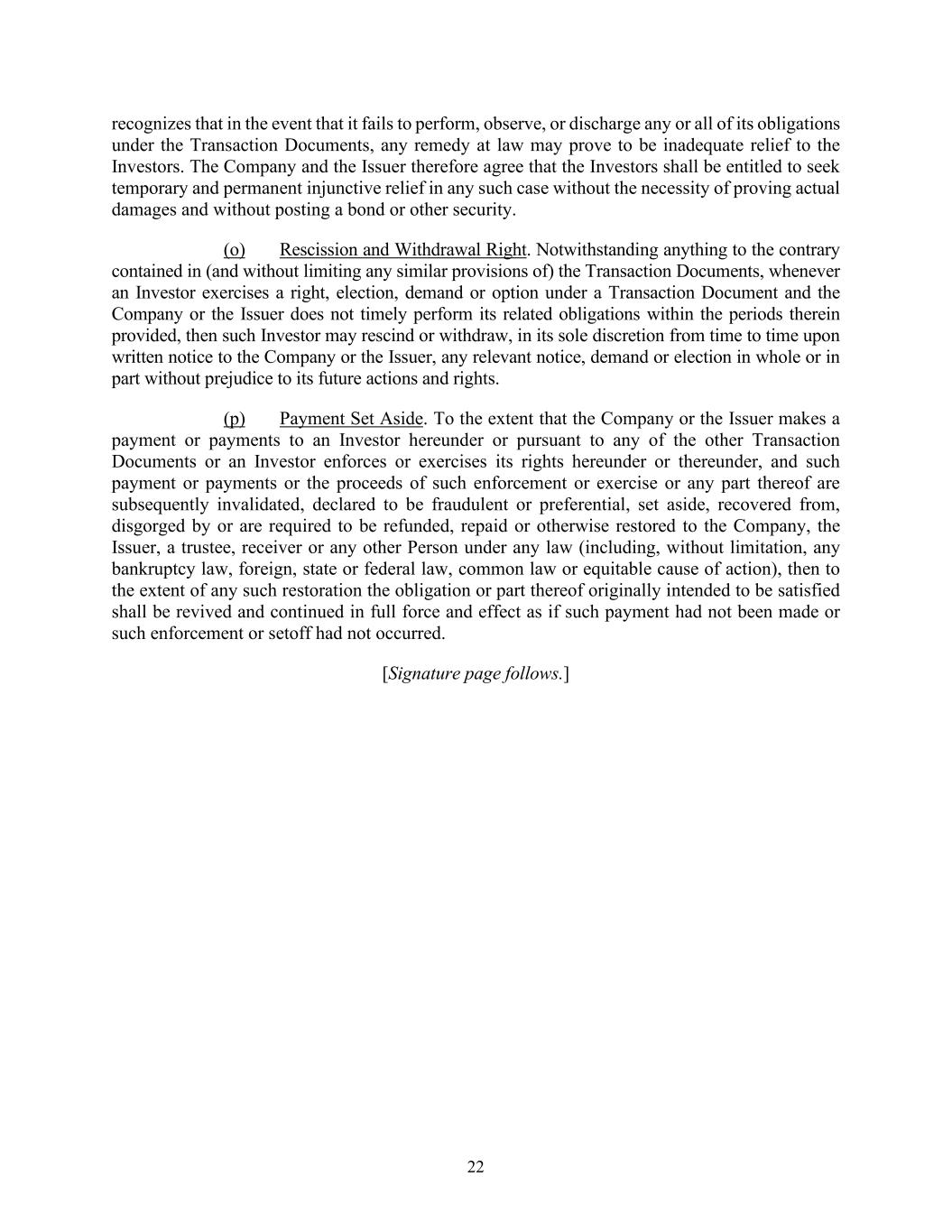 22 recognizes that in the event that it fails to perform, observe, or discharge any or all of its obligations under the Transaction Documents, any remedy at law may prove to be inadequate relief to the Investors. The Company and the Issuer therefore agree that the Investors shall be entitled to seek temporary and permanent injunctive relief in any such case without the necessity of proving actual damages and without posting a bond or other security. (o) Rescission and Withdrawal Right. Notwithstanding anything to the contrary contained in (and without limiting any similar provisions of) the Transaction Documents, whenever an Investor exercises a right, election, demand or option under a Transaction Document and the Company or the Issuer does not timely perform its related obligations within the periods therein provided, then such Investor may rescind or withdraw, in its sole discretion from time to time upon written notice to the Company or the Issuer, any relevant notice, demand or election in whole or in part without prejudice to its future actions and rights. (p) Payment Set Aside. To the extent that the Company or the Issuer makes a payment or payments to an Investor hereunder or pursuant to any of the other Transaction Documents or an Investor enforces or exercises its rights hereunder or thereunder, and such payment or payments or the proceeds of such enforcement or exercise or any part thereof are subsequently invalidated, declared to be fraudulent or preferential, set aside, recovered from, disgorged by or are required to be refunded, repaid or otherwise restored to the Company, the Issuer, a trustee, receiver or any other Person under any law (including, without limitation, any bankruptcy law, foreign, state or federal law, common law or equitable cause of action), then to the extent of any such restoration the obligation or part thereof originally intended to be satisfied shall be revived and continued in full force and effect as if such payment had not been made or such enforcement or setoff had not occurred. [Signature page follows.]