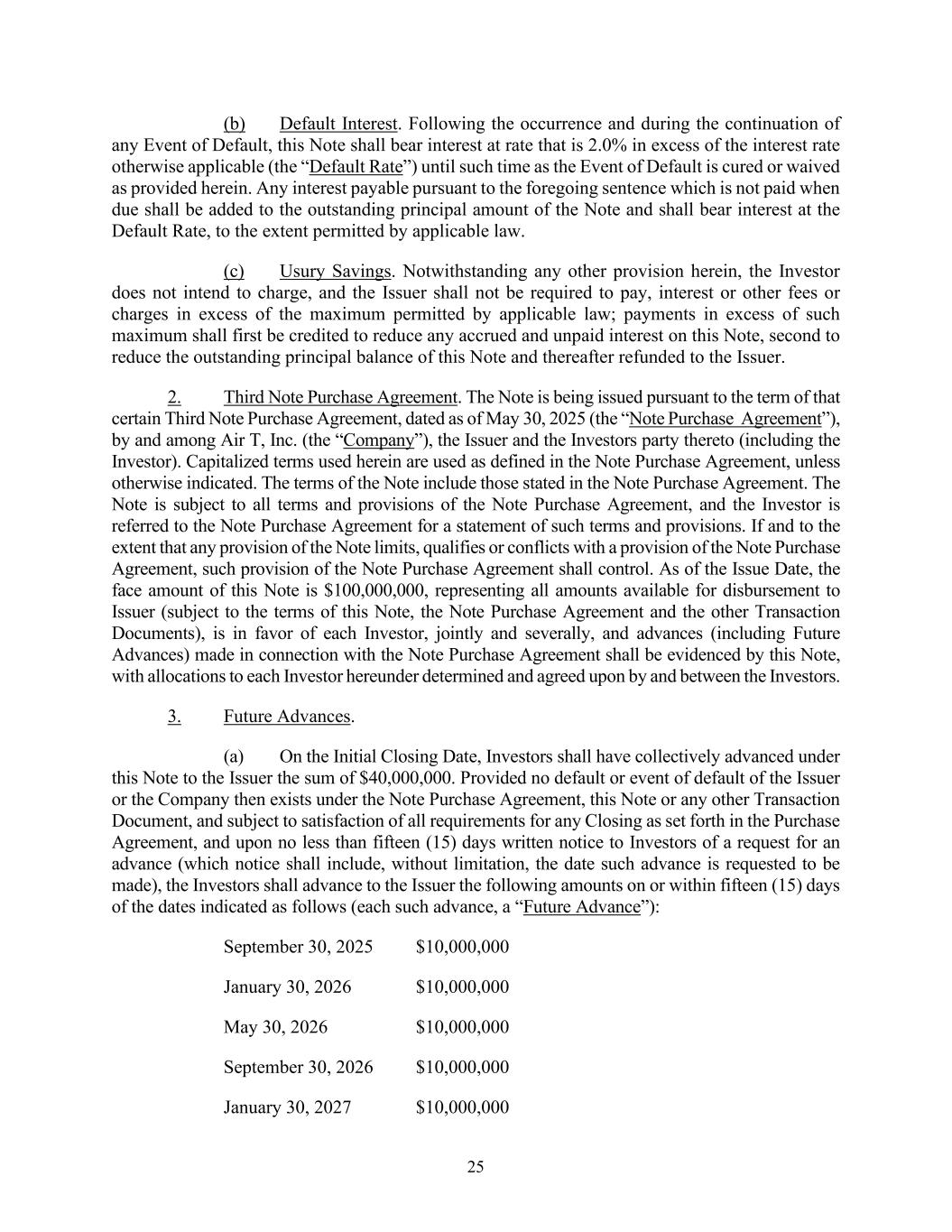 25 (b) Default Interest. Following the occurrence and during the continuation of any Event of Default, this Note shall bear interest at rate that is 2.0% in excess of the interest rate otherwise applicable (the “Default Rate”) until such time as the Event of Default is cured or waived as provided herein. Any interest payable pursuant to the foregoing sentence which is not paid when due shall be added to the outstanding principal amount of the Note and shall bear interest at the Default Rate, to the extent permitted by applicable law. (c) Usury Savings. Notwithstanding any other provision herein, the Investor does not intend to charge, and the Issuer shall not be required to pay, interest or other fees or charges in excess of the maximum permitted by applicable law; payments in excess of such maximum shall first be credited to reduce any accrued and unpaid interest on this Note, second to reduce the outstanding principal balance of this Note and thereafter refunded to the Issuer. 2. Third Note Purchase Agreement. The Note is being issued pursuant to the term of that certain Third Note Purchase Agreement, dated as of May 30, 2025 (the “Note Purchase Agreement”), by and among Air T, Inc. (the “Company”), the Issuer and the Investors party thereto (including the Investor). Capitalized terms used herein are used as defined in the Note Purchase Agreement, unless otherwise indicated. The terms of the Note include those stated in the Note Purchase Agreement. The Note is subject to all terms and provisions of the Note Purchase Agreement, and the Investor is referred to the Note Purchase Agreement for a statement of such terms and provisions. If and to the extent that any provision of the Note limits, qualifies or conflicts with a provision of the Note Purchase Agreement, such provision of the Note Purchase Agreement shall control. As of the Issue Date, the face amount of this Note is $100,000,000, representing all amounts available for disbursement to Issuer (subject to the terms of this Note, the Note Purchase Agreement and the other Transaction Documents), is in favor of each Investor, jointly and severally, and advances (including Future Advances) made in connection with the Note Purchase Agreement shall be evidenced by this Note, with allocations to each Investor hereunder determined and agreed upon by and between the Investors. 3. Future Advances. (a) On the Initial Closing Date, Investors shall have collectively advanced under this Note to the Issuer the sum of $40,000,000. Provided no default or event of default of the Issuer or the Company then exists under the Note Purchase Agreement, this Note or any other Transaction Document, and subject to satisfaction of all requirements for any Closing as set forth in the Purchase Agreement, and upon no less than fifteen (15) days written notice to Investors of a request for an advance (which notice shall include, without limitation, the date such advance is requested to be made), the Investors shall advance to the Issuer the following amounts on or within fifteen (15) days of the dates indicated as follows (each such advance, a “Future Advance”): September 30, 2025 $10,000,000 January 30, 2026 $10,000,000 May 30, 2026 $10,000,000 September 30, 2026 $10,000,000 January 30, 2027 $10,000,000