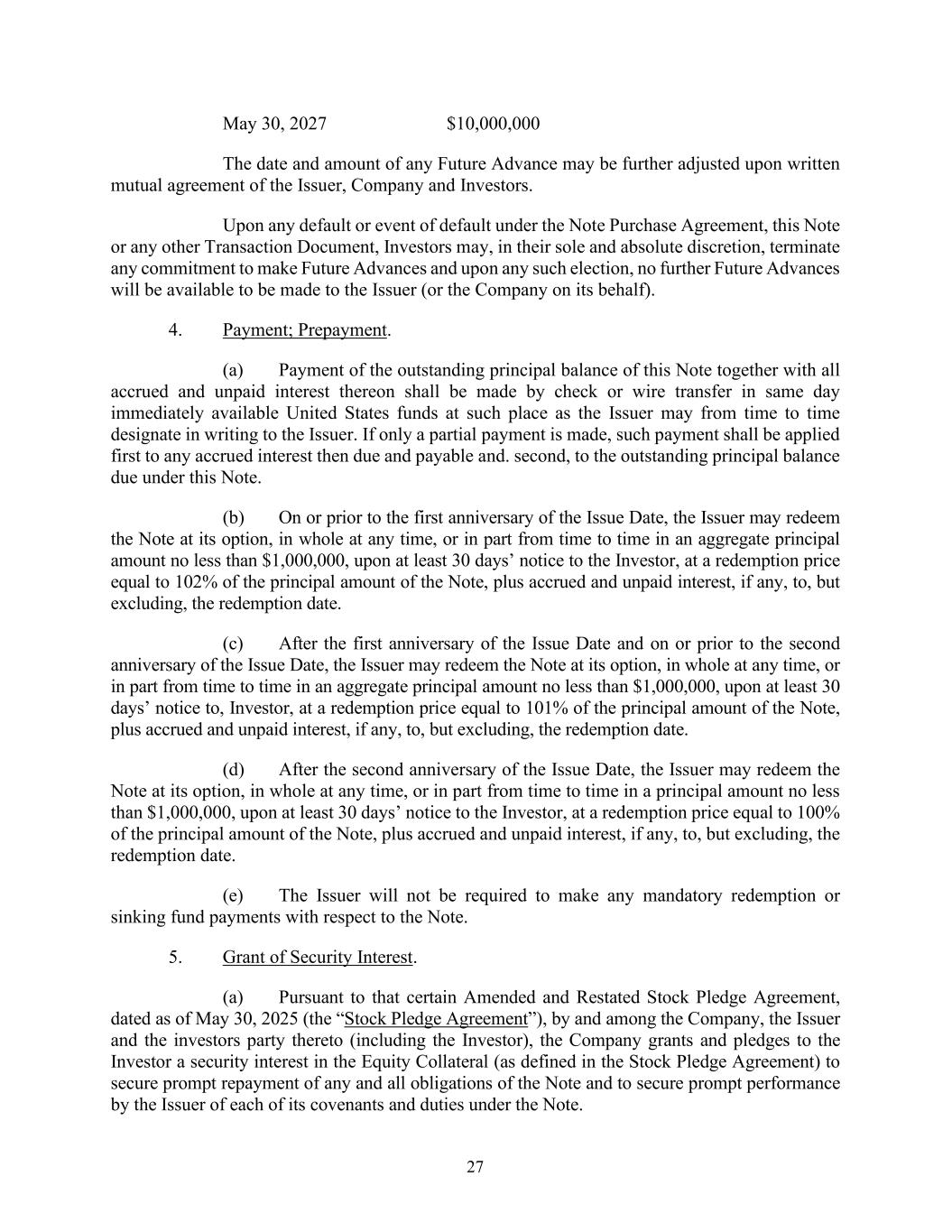 27 May 30, 2027 $10,000,000 The date and amount of any Future Advance may be further adjusted upon written mutual agreement of the Issuer, Company and Investors. Upon any default or event of default under the Note Purchase Agreement, this Note or any other Transaction Document, Investors may, in their sole and absolute discretion, terminate any commitment to make Future Advances and upon any such election, no further Future Advances will be available to be made to the Issuer (or the Company on its behalf). 4. Payment; Prepayment. (a) Payment of the outstanding principal balance of this Note together with all accrued and unpaid interest thereon shall be made by check or wire transfer in same day immediately available United States funds at such place as the Issuer may from time to time designate in writing to the Issuer. If only a partial payment is made, such payment shall be applied first to any accrued interest then due and payable and. second, to the outstanding principal balance due under this Note. (b) On or prior to the first anniversary of the Issue Date, the Issuer may redeem the Note at its option, in whole at any time, or in part from time to time in an aggregate principal amount no less than $1,000,000, upon at least 30 days’ notice to the Investor, at a redemption price equal to 102% of the principal amount of the Note, plus accrued and unpaid interest, if any, to, but excluding, the redemption date. (c) After the first anniversary of the Issue Date and on or prior to the second anniversary of the Issue Date, the Issuer may redeem the Note at its option, in whole at any time, or in part from time to time in an aggregate principal amount no less than $1,000,000, upon at least 30 days’ notice to, Investor, at a redemption price equal to 101% of the principal amount of the Note, plus accrued and unpaid interest, if any, to, but excluding, the redemption date. (d) After the second anniversary of the Issue Date, the Issuer may redeem the Note at its option, in whole at any time, or in part from time to time in a principal amount no less than $1,000,000, upon at least 30 days’ notice to the Investor, at a redemption price equal to 100% of the principal amount of the Note, plus accrued and unpaid interest, if any, to, but excluding, the redemption date. (e) The Issuer will not be required to make any mandatory redemption or sinking fund payments with respect to the Note. 5. Grant of Security Interest. (a) Pursuant to that certain Amended and Restated Stock Pledge Agreement, dated as of May 30, 2025 (the “Stock Pledge Agreement”), by and among the Company, the Issuer and the investors party thereto (including the Investor), the Company grants and pledges to the Investor a security interest in the Equity Collateral (as defined in the Stock Pledge Agreement) to secure prompt repayment of any and all obligations of the Note and to secure prompt performance by the Issuer of each of its covenants and duties under the Note.
