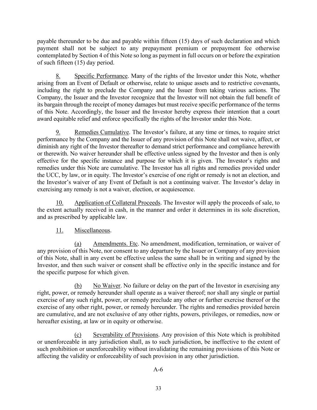 33 payable thereunder to be due and payable within fifteen (15) days of such declaration and which payment shall not be subject to any prepayment premium or prepayment fee otherwise contemplated by Section 4 of this Note so long as payment in full occurs on or before the expiration of such fifteen (15) day period. 8. Specific Performance. Many of the rights of the Investor under this Note, whether arising from an Event of Default or otherwise, relate to unique assets and to restrictive covenants, including the right to preclude the Company and the Issuer from taking various actions. The Company, the Issuer and the Investor recognize that the Investor will not obtain the full benefit of its bargain through the receipt of money damages but must receive specific performance of the terms of this Note. Accordingly, the Issuer and the Investor hereby express their intention that a court award equitable relief and enforce specifically the rights of the Investor under this Note. 9. Remedies Cumulative. The Investor’s failure, at any time or times, to require strict performance by the Company and the Issuer of any provision of this Note shall not waive, affect, or diminish any right of the Investor thereafter to demand strict performance and compliance herewith or therewith. No waiver hereunder shall be effective unless signed by the Investor and then is only effective for the specific instance and purpose for which it is given. The Investor’s rights and remedies under this Note are cumulative. The Investor has all rights and remedies provided under the UCC, by law, or in equity. The Investor’s exercise of one right or remedy is not an election, and the Investor’s waiver of any Event of Default is not a continuing waiver. The Investor’s delay in exercising any remedy is not a waiver, election, or acquiescence. 10. Application of Collateral Proceeds. The Investor will apply the proceeds of sale, to the extent actually received in cash, in the manner and order it determines in its sole discretion, and as prescribed by applicable law. 11. Miscellaneous. (a) Amendments. Etc. No amendment, modification, termination, or waiver of any provision of this Note, nor consent to any departure by the Issuer or Company of any provision of this Note, shall in any event be effective unless the same shall be in writing and signed by the Investor, and then such waiver or consent shall be effective only in the specific instance and for the specific purpose for which given. (b) No Waiver. No failure or delay on the part of the Investor in exercising any right, power, or remedy hereunder shall operate as a waiver thereof; nor shall any single or partial exercise of any such right, power, or remedy preclude any other or further exercise thereof or the exercise of any other right, power, or remedy hereunder. The rights and remedies provided herein are cumulative, and are not exclusive of any other rights, powers, privileges, or remedies, now or hereafter existing, at law or in equity or otherwise. (c) Severability of Provisions. Any provision of this Note which is prohibited or unenforceable in any jurisdiction shall, as to such jurisdiction, be ineffective to the extent of such prohibition or unenforceability without invalidating the remaining provisions of this Note or affecting the validity or enforceability of such provision in any other jurisdiction. A-6