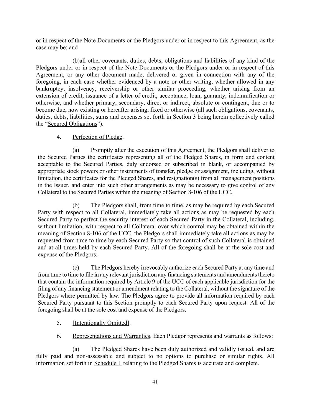 41 or in respect of the Note Documents or the Pledgors under or in respect to this Agreement, as the case may be; and (b)all other covenants, duties, debts, obligations and liabilities of any kind of the Pledgors under or in respect of the Note Documents or the Pledgors under or in respect of this Agreement, or any other document made, delivered or given in connection with any of the foregoing, in each case whether evidenced by a note or other writing, whether allowed in any bankruptcy, insolvency, receivership or other similar proceeding, whether arising from an extension of credit, issuance of a letter of credit, acceptance, loan, guaranty, indemnification or otherwise, and whether primary, secondary, direct or indirect, absolute or contingent, due or to become due, now existing or hereafter arising, fixed or otherwise (all such obligations, covenants, duties, debts, liabilities, sums and expenses set forth in Section 3 being herein collectively called the “Secured Obligations”). 4. Perfection of Pledge. (a) Promptly after the execution of this Agreement, the Pledgors shall deliver to the Secured Parties the certificates representing all of the Pledged Shares, in form and content acceptable to the Secured Parties, duly endorsed or subscribed in blank, or accompanied by appropriate stock powers or other instruments of transfer, pledge or assignment, including, without limitation, the certificates for the Pledged Shares, and resignation(s) from all management positions in the Issuer, and enter into such other arrangements as may be necessary to give control of any Collateral to the Secured Parties within the meaning of Section 8-106 of the UCC. (b) The Pledgors shall, from time to time, as may be required by each Secured Party with respect to all Collateral, immediately take all actions as may be requested by each Secured Party to perfect the security interest of each Secured Party in the Collateral, including, without limitation, with respect to all Collateral over which control may be obtained within the meaning of Section 8-106 of the UCC, the Pledgors shall immediately take all actions as may be requested from time to time by each Secured Party so that control of such Collateral is obtained and at all times held by each Secured Party. All of the foregoing shall be at the sole cost and expense of the Pledgors. (c) The Pledgors hereby irrevocably authorize each Secured Party at any time and from time to time to file in any relevant jurisdiction any financing statements and amendments thereto that contain the information required by Article 9 of the UCC of each applicable jurisdiction for the filing of any financing statement or amendment relating to the Collateral, without the signature of the Pledgors where permitted by law. The Pledgors agree to provide all information required by each Secured Party pursuant to this Section promptly to each Secured Party upon request. All of the foregoing shall be at the sole cost and expense of the Pledgors. 5. [Intentionally Omitted]. 6. Representations and Warranties. Each Pledgor represents and warrants as follows: (a) The Pledged Shares have been duly authorized and validly issued, and are fully paid and non-assessable and subject to no options to purchase or similar rights. All information set forth in Schedule I relating to the Pledged Shares is accurate and complete.
