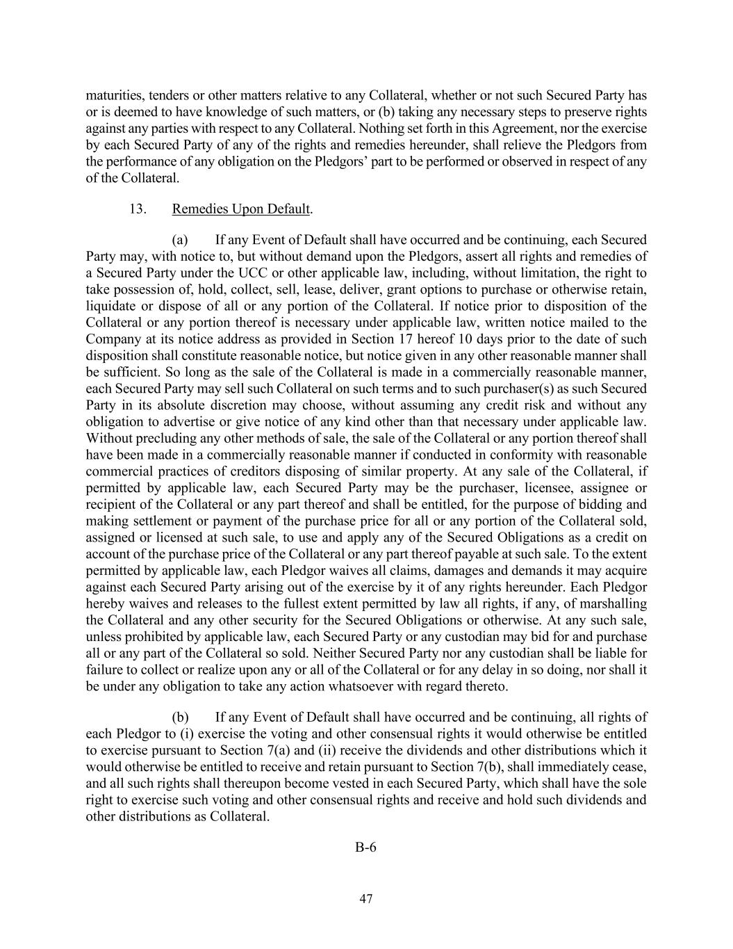 47 maturities, tenders or other matters relative to any Collateral, whether or not such Secured Party has or is deemed to have knowledge of such matters, or (b) taking any necessary steps to preserve rights against any parties with respect to any Collateral. Nothing set forth in this Agreement, nor the exercise by each Secured Party of any of the rights and remedies hereunder, shall relieve the Pledgors from the performance of any obligation on the Pledgors’ part to be performed or observed in respect of any of the Collateral. 13. Remedies Upon Default. (a) If any Event of Default shall have occurred and be continuing, each Secured Party may, with notice to, but without demand upon the Pledgors, assert all rights and remedies of a Secured Party under the UCC or other applicable law, including, without limitation, the right to take possession of, hold, collect, sell, lease, deliver, grant options to purchase or otherwise retain, liquidate or dispose of all or any portion of the Collateral. If notice prior to disposition of the Collateral or any portion thereof is necessary under applicable law, written notice mailed to the Company at its notice address as provided in Section 17 hereof 10 days prior to the date of such disposition shall constitute reasonable notice, but notice given in any other reasonable manner shall be sufficient. So long as the sale of the Collateral is made in a commercially reasonable manner, each Secured Party may sell such Collateral on such terms and to such purchaser(s) as such Secured Party in its absolute discretion may choose, without assuming any credit risk and without any obligation to advertise or give notice of any kind other than that necessary under applicable law. Without precluding any other methods of sale, the sale of the Collateral or any portion thereof shall have been made in a commercially reasonable manner if conducted in conformity with reasonable commercial practices of creditors disposing of similar property. At any sale of the Collateral, if permitted by applicable law, each Secured Party may be the purchaser, licensee, assignee or recipient of the Collateral or any part thereof and shall be entitled, for the purpose of bidding and making settlement or payment of the purchase price for all or any portion of the Collateral sold, assigned or licensed at such sale, to use and apply any of the Secured Obligations as a credit on account of the purchase price of the Collateral or any part thereof payable at such sale. To the extent permitted by applicable law, each Pledgor waives all claims, damages and demands it may acquire against each Secured Party arising out of the exercise by it of any rights hereunder. Each Pledgor hereby waives and releases to the fullest extent permitted by law all rights, if any, of marshalling the Collateral and any other security for the Secured Obligations or otherwise. At any such sale, unless prohibited by applicable law, each Secured Party or any custodian may bid for and purchase all or any part of the Collateral so sold. Neither Secured Party nor any custodian shall be liable for failure to collect or realize upon any or all of the Collateral or for any delay in so doing, nor shall it be under any obligation to take any action whatsoever with regard thereto. (b) If any Event of Default shall have occurred and be continuing, all rights of each Pledgor to (i) exercise the voting and other consensual rights it would otherwise be entitled to exercise pursuant to Section 7(a) and (ii) receive the dividends and other distributions which it would otherwise be entitled to receive and retain pursuant to Section 7(b), shall immediately cease, and all such rights shall thereupon become vested in each Secured Party, which shall have the sole right to exercise such voting and other consensual rights and receive and hold such dividends and other distributions as Collateral. B-6