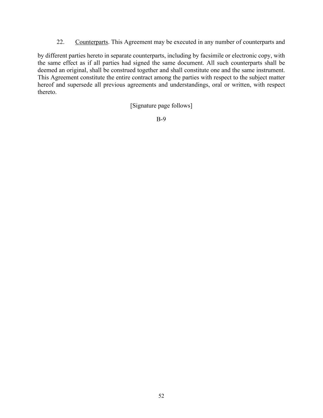 52 22. Counterparts. This Agreement may be executed in any number of counterparts and by different parties hereto in separate counterparts, including by facsimile or electronic copy, with the same effect as if all parties had signed the same document. All such counterparts shall be deemed an original, shall be construed together and shall constitute one and the same instrument. This Agreement constitute the entire contract among the parties with respect to the subject matter hereof and supersede all previous agreements and understandings, oral or written, with respect thereto. [Signature page follows] B-9