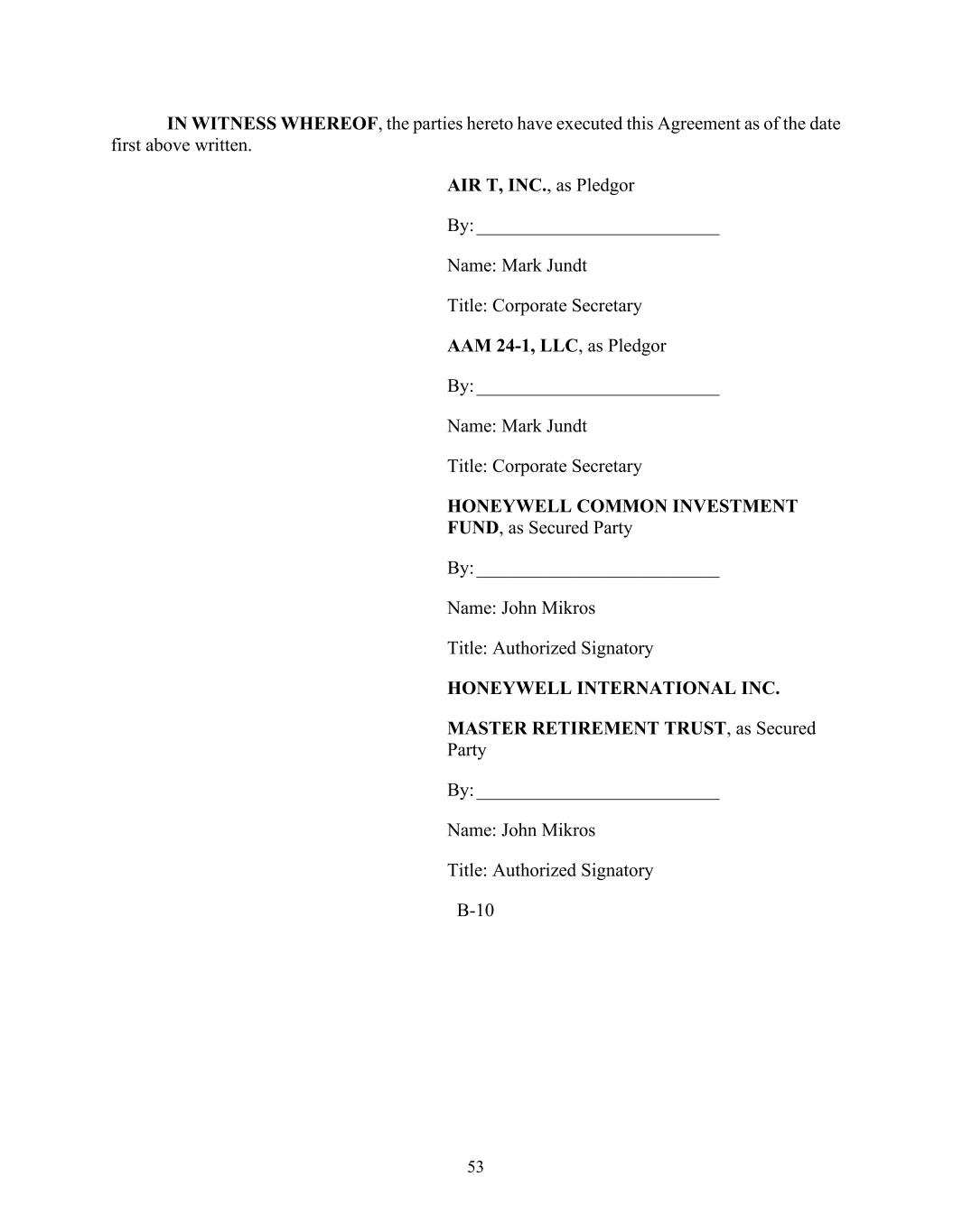 53 IN WITNESS WHEREOF, the parties hereto have executed this Agreement as of the date first above written. AIR T, INC., as Pledgor By: __________________________ Name: Mark Jundt Title: Corporate Secretary AAM 24-1, LLC, as Pledgor By: __________________________ Name: Mark Jundt Title: Corporate Secretary HONEYWELL COMMON INVESTMENT FUND, as Secured Party By: __________________________ Name: John Mikros Title: Authorized Signatory HONEYWELL INTERNATIONAL INC. MASTER RETIREMENT TRUST, as Secured Party By: __________________________ Name: John Mikros Title: Authorized Signatory B-10