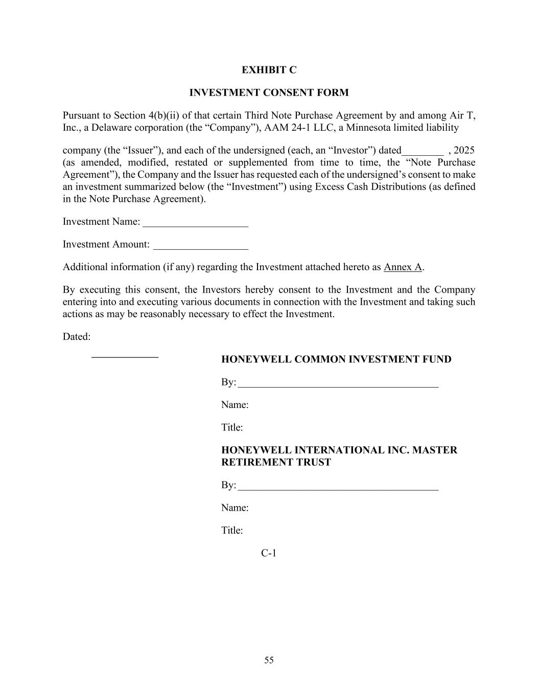 55 EXHIBIT C INVESTMENT CONSENT FORM Pursuant to Section 4(b)(ii) of that certain Third Note Purchase Agreement by and among Air T, Inc., a Delaware corporation (the “Company”), AAM 24-1 LLC, a Minnesota limited liability company (the “Issuer”), and each of the undersigned (each, an “Investor”) dated________ , 2025 (as amended, modified, restated or supplemented from time to time, the “Note Purchase Agreement”), the Company and the Issuer has requested each of the undersigned’s consent to make an investment summarized below (the “Investment”) using Excess Cash Distributions (as defined in the Note Purchase Agreement). Investment Name: ____________________ Investment Amount: __________________ Additional information (if any) regarding the Investment attached hereto as Annex A. By executing this consent, the Investors hereby consent to the Investment and the Company entering into and executing various documents in connection with the Investment and taking such actions as may be reasonably necessary to effect the Investment. Dated: HONEYWELL COMMON INVESTMENT FUND By: ______________________________________ Name: Title: HONEYWELL INTERNATIONAL INC. MASTER RETIREMENT TRUST By: ______________________________________ Name: Title: C-1
