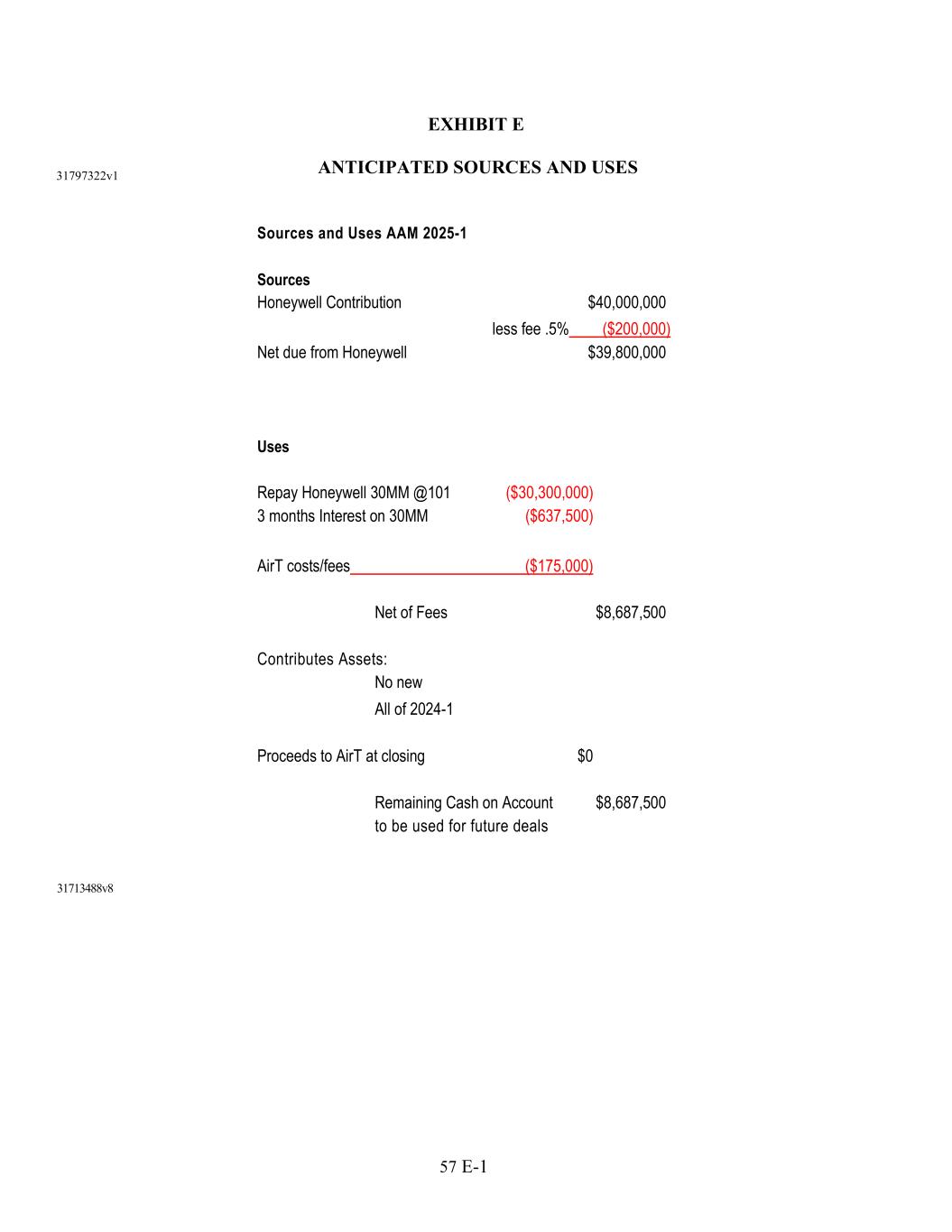 57 31797322v1 EXHIBIT E ANTICIPATED SOURCES AND USES Sources and Uses AAM 2025-1 Sources Honeywell Contribution $40,000,000 less fee .5% ($200,000) Net due from Honeywell $39,800,000 Uses Repay Honeywell 30MM @101 ($30,300,000) 3 months Interest on 30MM ($637,500) AirT costs/fees ($175,000) Net of Fees $8,687,500 Contributes Assets: No new All of 2024-1 Proceeds to AirT at closing $0 Remaining Cash on Account $8,687,500 to be used for future deals 31713488v8 E-1