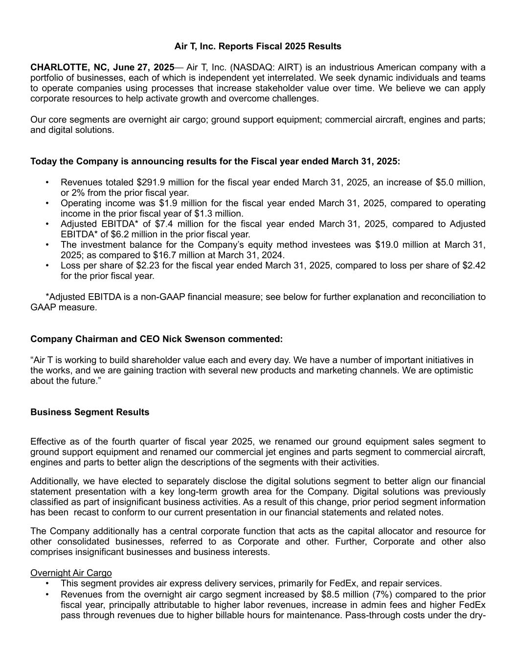 Air T, Inc. Reports Fiscal 2025 Results CHARLOTTE, NC, June 27, 2025— Air T, Inc. (NASDAQ: AIRT) is an industrious American company with a portfolio of businesses, each of which is independent yet interrelated. We seek dynamic individuals and teams to operate companies using processes that increase stakeholder value over time. We believe we can apply corporate resources to help activate growth and overcome challenges. Our core segments are overnight air cargo; ground support equipment; commercial aircraft, engines and parts; and digital solutions. Today the Company is announcing results for the Fiscal year ended March 31, 2025: • Revenues totaled $291.9 million for the fiscal year ended March 31, 2025, an increase of $5.0 million, or 2% from the prior fiscal year. • Operating income was $1.9 million for the fiscal year ended March 31, 2025, compared to operating income in the prior fiscal year of $1.3 million. • Adjusted EBITDA* of $7.4 million for the fiscal year ended March 31, 2025, compared to Adjusted EBITDA* of $6.2 million in the prior fiscal year. • The investment balance for the Company’s equity method investees was $19.0 million at March 31, 2025; as compared to $16.7 million at March 31, 2024. • Loss per share of $2.23 for the fiscal year ended March 31, 2025, compared to loss per share of $2.42 for the prior fiscal year. *Adjusted EBITDA is a non-GAAP financial measure; see below for further explanation and reconciliation to GAAP measure. Company Chairman and CEO Nick Swenson commented: “Air T is working to build shareholder value each and every day. We have a number of important initiatives in the works, and we are gaining traction with several new products and marketing channels. We are optimistic about the future.” Business Segment Results Effective as of the fourth quarter of fiscal year 2025, we renamed our ground equipment sales segment to ground support equipment and renamed our commercial jet engines and parts segment to commercial aircraft, engines and parts to better align the descriptions of the segments with their activities. Additionally, we have elected to separately disclose the digital solutions segment to better align our financial statement presentation with a key long-term growth area for the Company. Digital solutions was previously classified as part of insignificant business activities. As a result of this change, prior period segment information has been recast to conform to our current presentation in our financial statements and related notes. The Company additionally has a central corporate function that acts as the capital allocator and resource for other consolidated businesses, referred to as Corporate and other. Further, Corporate and other also comprises insignificant businesses and business interests. Overnight Air Cargo • This segment provides air express delivery services, primarily for FedEx, and repair services. • Revenues from the overnight air cargo segment increased by $8.5 million (7%) compared to the prior fiscal year, principally attributable to higher labor revenues, increase in admin fees and higher FedEx pass through revenues due to higher billable hours for maintenance. Pass-through costs under the dry-