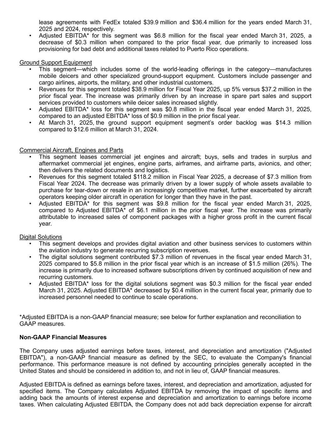 lease agreements with FedEx totaled $39.9 million and $36.4 million for the years ended March 31, 2025 and 2024, respectively. • Adjusted EBITDA* for this segment was $6.8 million for the fiscal year ended March 31, 2025, a decrease of $0.3 million when compared to the prior fiscal year, due primarily to increased loss provisioning for bad debt and additional taxes related to Puerto Rico operations. Ground Support Equipment • This segment—which includes some of the world-leading offerings in the category—manufactures mobile deicers and other specialized ground-support equipment. Customers include passenger and cargo airlines, airports, the military, and other industrial customers. • Revenues for this segment totaled $38.9 million for Fiscal Year 2025, up 5% versus $37.2 million in the prior fiscal year. The increase was primarily driven by an increase in spare part sales and support services provided to customers while deicer sales increased slightly. • Adjusted EBITDA* loss for this segment was $0.8 million in the fiscal year ended March 31, 2025, compared to an adjusted EBITDA* loss of $0.9 million in the prior fiscal year. • At March 31, 2025, the ground support equipment segment’s order backlog was $14.3 million compared to $12.6 million at March 31, 2024. Commercial Aircraft, Engines and Parts • This segment leases commercial jet engines and aircraft; buys, sells and trades in surplus and aftermarket commercial jet engines, engine parts, airframes, and airframe parts, avionics, and other; then delivers the related documents and logistics. • Revenues for this segment totaled $118.2 million in Fiscal Year 2025, a decrease of $7.3 million from Fiscal Year 2024. The decrease was primarily driven by a lower supply of whole assets available to purchase for tear-down or resale in an increasingly competitive market, further exacerbated by aircraft operators keeping older aircraft in operation for longer than they have in the past. • Adjusted EBITDA* for this segment was $9.8 million for the fiscal year ended March 31, 2025, compared to Adjusted EBITDA* of $6.1 million in the prior fiscal year. The increase was primarily attributable to increased sales of component packages with a higher gross profit in the current fiscal year. Digital Solutions • This segment develops and provides digital aviation and other business services to customers within the aviation industry to generate recurring subscription revenues. • The digital solutions segment contributed $7.3 million of revenues in the fiscal year ended March 31, 2025 compared to $5.8 million in the prior fiscal year which is an increase of $1.5 million (26%). The increase is primarily due to increased software subscriptions driven by continued acquisition of new and recurring customers. • Adjusted EBITDA* loss for the digital solutions segment was $0.3 million for the fiscal year ended March 31, 2025. Adjusted EBITDA* decreased by $0.4 million in the current fiscal year, primarily due to increased personnel needed to continue to scale operations. *Adjusted EBITDA is a non-GAAP financial measure; see below for further explanation and reconciliation to GAAP measures. Non-GAAP Financial Measures The Company uses adjusted earnings before taxes, interest, and depreciation and amortization ("Adjusted EBITDA"), a non-GAAP financial measure as defined by the SEC, to evaluate the Company's financial performance. This performance measure is not defined by accounting principles generally accepted in the United States and should be considered in addition to, and not in lieu of, GAAP financial measures. Adjusted EBITDA is defined as earnings before taxes, interest, and depreciation and amortization, adjusted for specified items. The Company calculates Adjusted EBITDA by removing the impact of specific items and adding back the amounts of interest expense and depreciation and amortization to earnings before income taxes. When calculating Adjusted EBITDA, the Company does not add back depreciation expense for aircraft