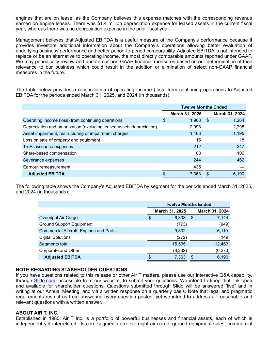 engines that are on lease, as the Company believes this expense matches with the corresponding revenue earned on engine leases. There was $1.4 million depreciation expense for leased assets in the current fiscal year, whereas there was no depreciation expense in the prior fiscal year. Management believes that Adjusted EBITDA is a useful measure of the Company's performance because it provides investors additional information about the Company's operations allowing better evaluation of underlying business performance and better period-to-period comparability. Adjusted EBITDA is not intended to replace or be an alternative to operating income, the most directly comparable amounts reported under GAAP. We may periodically review and update our non-GAAP financial measures based on our determination of their relevance to our business which could result in the addition or elimination of select non-GAAP financial measures in the future. The table below provides a reconciliation of operating income (loss) from continuing operations to Adjusted EBITDA for the periods ended March 31, 2025, and 2024 (in thousands): Twelve Months Ended March 31, 2025 March 31, 2024 Operating income (loss) from continuing operations $ 1,908 $ 1,264 Depreciation and amortization (excluding leased assets depreciation) 2,998 2,798 Asset impairment, restructuring or impairment charges 1,463 1,195 Loss on sale of property and equipment 15 18 TruPs issuance expenses 212 347 Share-based compensation 88 106 Severance expenses 244 462 Earnout remeasurement 435 — Adjusted EBITDA $ 7,363 $ 6,190 The following table shows the Company’s Adjusted EBITDA by segment for the periods ended March 31, 2025, and 2024 (in thousands): Twelve Months Ended March 31, 2025 March 31, 2024 Overnight Air Cargo $ 6,808 $ 7,144 Ground Support Equipment (773) (949) Commercial Aircraft, Engines and Parts 9,832 6,119 Digital Solutions (272) 149 Segments total 15,595 12,463 Corporate and Other (8,232) (6,273) Adjusted EBITDA $ 7,363 $ 6,190 NOTE REGARDING STAKEHOLDER QUESTIONS If you have questions related to this release or other Air T matters, please use our interactive Q&A capability, through Slido.com, accessible from our website, to submit your questions. We intend to keep that link open and available for shareholder questions. Questions submitted through Slido will be answered “live” and in writing at our Annual Meeting, and via a written response on a quarterly basis. Note that legal and pragmatic requirements restrict us from answering every question posted, yet we intend to address all reasonable and relevant questions with a written answer. ABOUT AIR T, INC. Established in 1980, Air T Inc. is a portfolio of powerful businesses and financial assets, each of which is independent yet interrelated. Its core segments are overnight air cargo, ground equipment sales, commercial
