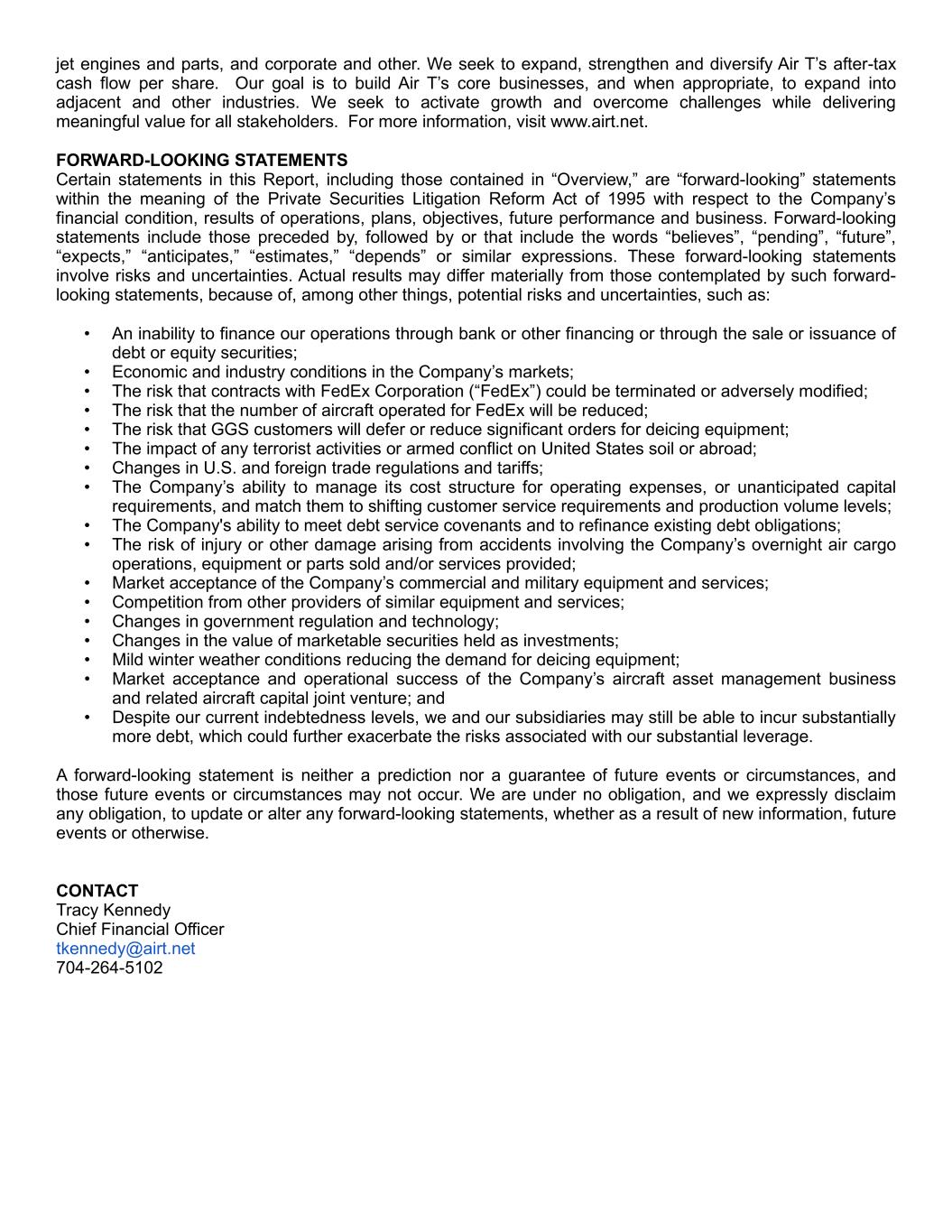 jet engines and parts, and corporate and other. We seek to expand, strengthen and diversify Air T’s after-tax cash flow per share. Our goal is to build Air T’s core businesses, and when appropriate, to expand into adjacent and other industries. We seek to activate growth and overcome challenges while delivering meaningful value for all stakeholders. For more information, visit www.airt.net. FORWARD-LOOKING STATEMENTS Certain statements in this Report, including those contained in “Overview,” are “forward-looking” statements within the meaning of the Private Securities Litigation Reform Act of 1995 with respect to the Company’s financial condition, results of operations, plans, objectives, future performance and business. Forward-looking statements include those preceded by, followed by or that include the words “believes”, “pending”, “future”, “expects,” “anticipates,” “estimates,” “depends” or similar expressions. These forward-looking statements involve risks and uncertainties. Actual results may differ materially from those contemplated by such forward- looking statements, because of, among other things, potential risks and uncertainties, such as: • An inability to finance our operations through bank or other financing or through the sale or issuance of debt or equity securities; • Economic and industry conditions in the Company’s markets; • The risk that contracts with FedEx Corporation (“FedEx”) could be terminated or adversely modified; • The risk that the number of aircraft operated for FedEx will be reduced; • The risk that GGS customers will defer or reduce significant orders for deicing equipment; • The impact of any terrorist activities or armed conflict on United States soil or abroad; • Changes in U.S. and foreign trade regulations and tariffs; • The Company’s ability to manage its cost structure for operating expenses, or unanticipated capital requirements, and match them to shifting customer service requirements and production volume levels; • The Company's ability to meet debt service covenants and to refinance existing debt obligations; • The risk of injury or other damage arising from accidents involving the Company’s overnight air cargo operations, equipment or parts sold and/or services provided; • Market acceptance of the Company’s commercial and military equipment and services; • Competition from other providers of similar equipment and services; • Changes in government regulation and technology; • Changes in the value of marketable securities held as investments; • Mild winter weather conditions reducing the demand for deicing equipment; • Market acceptance and operational success of the Company’s aircraft asset management business and related aircraft capital joint venture; and • Despite our current indebtedness levels, we and our subsidiaries may still be able to incur substantially more debt, which could further exacerbate the risks associated with our substantial leverage. A forward-looking statement is neither a prediction nor a guarantee of future events or circumstances, and those future events or circumstances may not occur. We are under no obligation, and we expressly disclaim any obligation, to update or alter any forward-looking statements, whether as a result of new information, future events or otherwise. CONTACT Tracy Kennedy Chief Financial Officer tkennedy@airt.net 704-264-5102