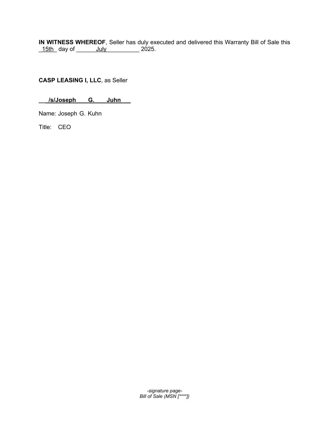 -signature page- Bill of Sale (MSN [****]) IN WITNESS WHEREOF, Seller has duly executed and delivered this Warranty Bill of Sale this _15th_ day of ______July__________ 2025. CASP LEASING I, LLC, as Seller ___/s/Joseph G. Juhn___ Name: Joseph G. Kuhn Title: CEO