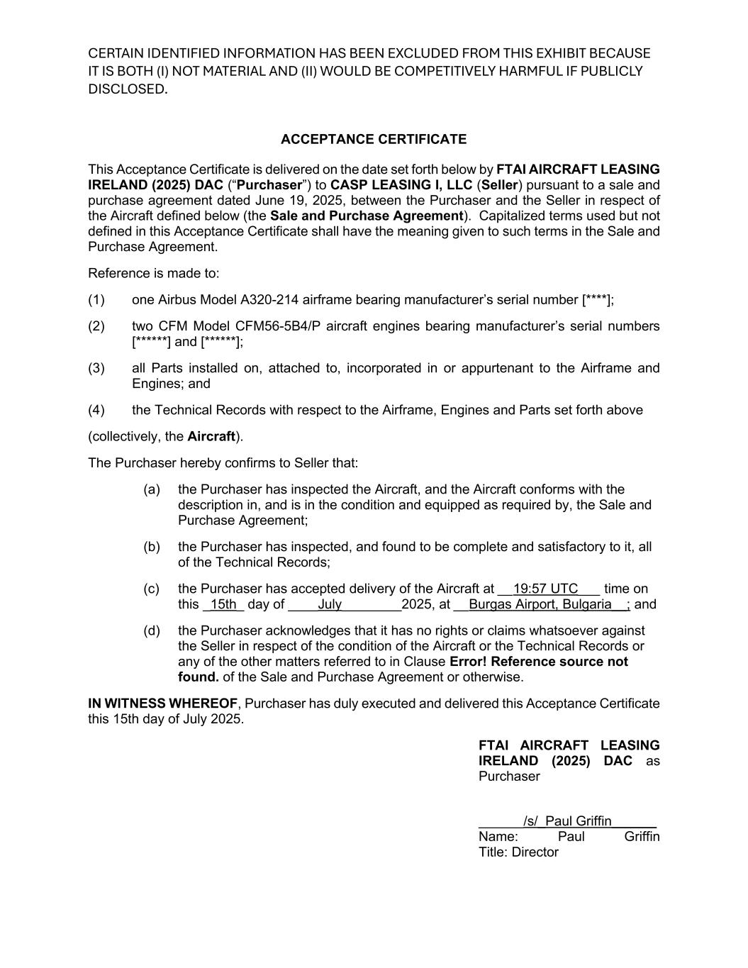 CERTAIN IDENTIFIED INFORMATION HAS BEEN EXCLUDED FROM THIS EXHIBIT BECAUSE IT IS BOTH (I) NOT MATERIAL AND (II) WOULD BE COMPETITIVELY HARMFUL IF PUBLICLY DISCLOSED. ACCEPTANCE CERTIFICATE This Acceptance Certificate is delivered on the date set forth below by FTAI AIRCRAFT LEASING IRELAND (2025) DAC (“Purchaser”) to CASP LEASING I, LLC (Seller) pursuant to a sale and purchase agreement dated June 19, 2025, between the Purchaser and the Seller in respect of the Aircraft defined below (the Sale and Purchase Agreement). Capitalized terms used but not defined in this Acceptance Certificate shall have the meaning given to such terms in the Sale and Purchase Agreement. Reference is made to: (1) one Airbus Model A320-214 airframe bearing manufacturer’s serial number [****]; (2) two CFM Model CFM56-5B4/P aircraft engines bearing manufacturer’s serial numbers [******] and [******]; (3) all Parts installed on, attached to, incorporated in or appurtenant to the Airframe and Engines; and (4) the Technical Records with respect to the Airframe, Engines and Parts set forth above (collectively, the Aircraft). The Purchaser hereby confirms to Seller that: (a) the Purchaser has inspected the Aircraft, and the Aircraft conforms with the description in, and is in the condition and equipped as required by, the Sale and Purchase Agreement; (b) the Purchaser has inspected, and found to be complete and satisfactory to it, all of the Technical Records; (c) the Purchaser has accepted delivery of the Aircraft at __19:57 UTC___ time on this _15th_ day of ____July________2025, at __Burgas Airport, Bulgaria__; and (d) the Purchaser acknowledges that it has no rights or claims whatsoever against the Seller in respect of the condition of the Aircraft or the Technical Records or any of the other matters referred to in Clause Error! Reference source not found. of the Sale and Purchase Agreement or otherwise. IN WITNESS WHEREOF, Purchaser has duly executed and delivered this Acceptance Certificate this 15th day of July 2025. FTAI AIRCRAFT LEASING IRELAND (2025) DAC as Purchaser ______/s/_Paul Griffin______ Name: Paul Griffin Title: Director