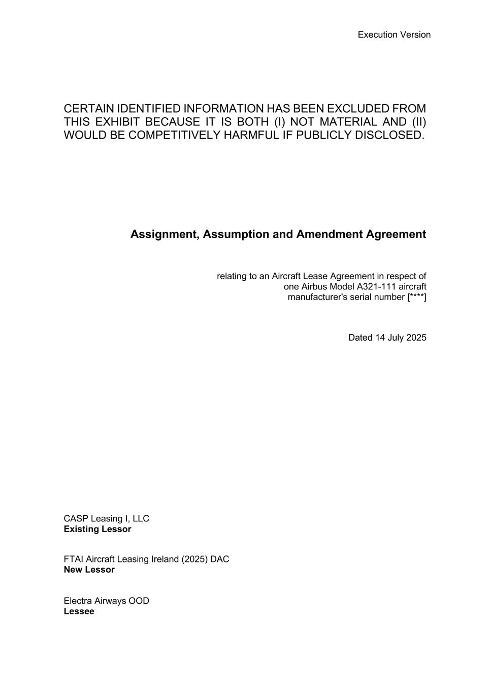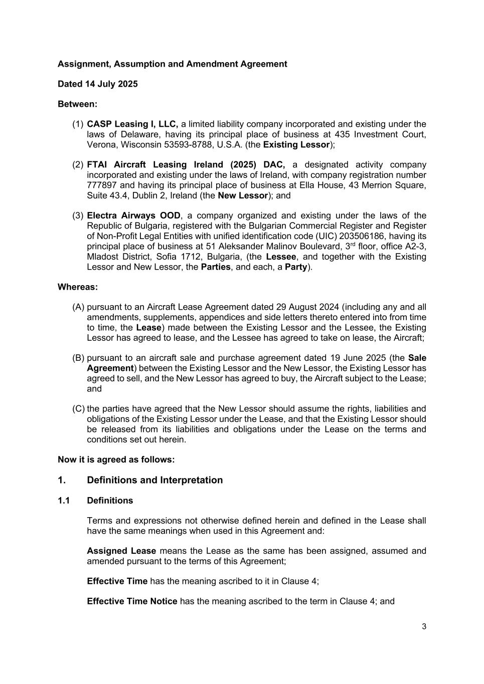 3 Assignment, Assumption and Amendment Agreement Dated 14 July 2025 Between: (1) CASP Leasing I, LLC, a limited liability company incorporated and existing under the laws of Delaware, having its principal place of business at 435 Investment Court, Verona, Wisconsin 53593-8788, U.S.A. (the Existing Lessor); (2) FTAI Aircraft Leasing Ireland (2025) DAC, a designated activity company incorporated and existing under the laws of Ireland, with company registration number 777897 and having its principal place of business at Ella House, 43 Merrion Square, Suite 43.4, Dublin 2, Ireland (the New Lessor); and (3) Electra Airways OOD, a company organized and existing under the laws of the Republic of Bulgaria, registered with the Bulgarian Commercial Register and Register of Non-Profit Legal Entities with unified identification code (UIC) 203506186, having its principal place of business at 51 Aleksander Malinov Boulevard, 3rd floor, office A2-3, Mladost District, Sofia 1712, Bulgaria, (the Lessee, and together with the Existing Lessor and New Lessor, the Parties, and each, a Party). Whereas: (A) pursuant to an Aircraft Lease Agreement dated 29 August 2024 (including any and all amendments, supplements, appendices and side letters thereto entered into from time to time, the Lease) made between the Existing Lessor and the Lessee, the Existing Lessor has agreed to lease, and the Lessee has agreed to take on lease, the Aircraft; (B) pursuant to an aircraft sale and purchase agreement dated 19 June 2025 (the Sale Agreement) between the Existing Lessor and the New Lessor, the Existing Lessor has agreed to sell, and the New Lessor has agreed to buy, the Aircraft subject to the Lease; and (C) the parties have agreed that the New Lessor should assume the rights, liabilities and obligations of the Existing Lessor under the Lease, and that the Existing Lessor should be released from its liabilities and obligations under the Lease on the terms and conditions set out herein. Now it is agreed as follows: 1. Definitions and Interpretation 1.1 Definitions Terms and expressions not otherwise defined herein and defined in the Lease shall have the same meanings when used in this Agreement and: Assigned Lease means the Lease as the same has been assigned, assumed and amended pursuant to the terms of this Agreement; Effective Time has the meaning ascribed to it in Clause 4; Effective Time Notice has the meaning ascribed to the term in Clause 4; and