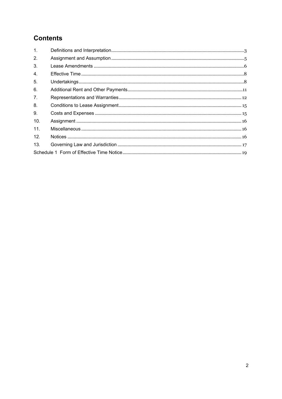 2 Contents 1. Definitions and Interpretation .......................................................................................................... 3 2. Assignment and Assumption .......................................................................................................... 5 3. Lease Amendments ........................................................................................................................ 6 4. Effective Time ..................................................................................................................................8 5. Undertakings ....................................................................................................................................8 6. Additional Rent and Other Payments............................................................................................11 7. Representations and Warranties .................................................................................................. 12 8. Conditions to Lease Assignment .................................................................................................. 15 9. Costs and Expenses ..................................................................................................................... 15 10. Assignment .................................................................................................................................... 16 11. Miscellaneous ................................................................................................................................ 16 12. Notices ........................................................................................................................................... 16 13. Governing Law and Jurisdiction ................................................................................................... 17 Schedule 1 Form of Effective Time Notice ............................................................................................... 19