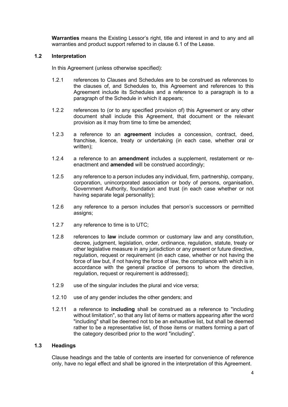 4 Warranties means the Existing Lessor’s right, title and interest in and to any and all warranties and product support referred to in clause 6.1 of the Lease. 1.2 Interpretation In this Agreement (unless otherwise specified): 1.2.1 references to Clauses and Schedules are to be construed as references to the clauses of, and Schedules to, this Agreement and references to this Agreement include its Schedules and a reference to a paragraph is to a paragraph of the Schedule in which it appears; 1.2.2 references to (or to any specified provision of) this Agreement or any other document shall include this Agreement, that document or the relevant provision as it may from time to time be amended; 1.2.3 a reference to an agreement includes a concession, contract, deed, franchise, licence, treaty or undertaking (in each case, whether oral or written); 1.2.4 a reference to an amendment includes a supplement, restatement or re- enactment and amended will be construed accordingly; 1.2.5 any reference to a person includes any individual, firm, partnership, company, corporation, unincorporated association or body of persons, organisation, Government Authority, foundation and trust (in each case whether or not having separate legal personality); 1.2.6 any reference to a person includes that person’s successors or permitted assigns; 1.2.7 any reference to time is to UTC; 1.2.8 references to law include common or customary law and any constitution, decree, judgment, legislation, order, ordinance, regulation, statute, treaty or other legislative measure in any jurisdiction or any present or future directive, regulation, request or requirement (in each case, whether or not having the force of law but, if not having the force of law, the compliance with which is in accordance with the general practice of persons to whom the directive, regulation, request or requirement is addressed); 1.2.9 use of the singular includes the plural and vice versa; 1.2.10 use of any gender includes the other genders; and 1.2.11 a reference to including shall be construed as a reference to "including without limitation", so that any list of items or matters appearing after the word "including" shall be deemed not to be an exhaustive list, but shall be deemed rather to be a representative list, of those items or matters forming a part of the category described prior to the word "including". 1.3 Headings Clause headings and the table of contents are inserted for convenience of reference only, have no legal effect and shall be ignored in the interpretation of this Agreement.
