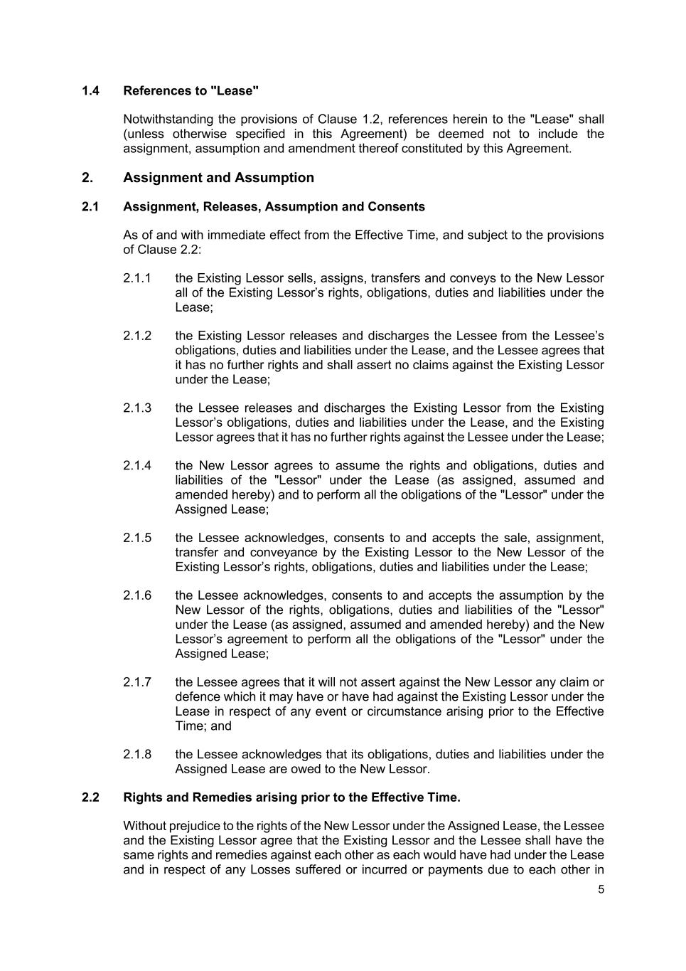 5 1.4 References to "Lease" Notwithstanding the provisions of Clause 1.2, references herein to the "Lease" shall (unless otherwise specified in this Agreement) be deemed not to include the assignment, assumption and amendment thereof constituted by this Agreement. 2. Assignment and Assumption 2.1 Assignment, Releases, Assumption and Consents As of and with immediate effect from the Effective Time, and subject to the provisions of Clause 2.2: 2.1.1 the Existing Lessor sells, assigns, transfers and conveys to the New Lessor all of the Existing Lessor’s rights, obligations, duties and liabilities under the Lease; 2.1.2 the Existing Lessor releases and discharges the Lessee from the Lessee’s obligations, duties and liabilities under the Lease, and the Lessee agrees that it has no further rights and shall assert no claims against the Existing Lessor under the Lease; 2.1.3 the Lessee releases and discharges the Existing Lessor from the Existing Lessor’s obligations, duties and liabilities under the Lease, and the Existing Lessor agrees that it has no further rights against the Lessee under the Lease; 2.1.4 the New Lessor agrees to assume the rights and obligations, duties and liabilities of the "Lessor" under the Lease (as assigned, assumed and amended hereby) and to perform all the obligations of the "Lessor" under the Assigned Lease; 2.1.5 the Lessee acknowledges, consents to and accepts the sale, assignment, transfer and conveyance by the Existing Lessor to the New Lessor of the Existing Lessor’s rights, obligations, duties and liabilities under the Lease; 2.1.6 the Lessee acknowledges, consents to and accepts the assumption by the New Lessor of the rights, obligations, duties and liabilities of the "Lessor" under the Lease (as assigned, assumed and amended hereby) and the New Lessor’s agreement to perform all the obligations of the "Lessor" under the Assigned Lease; 2.1.7 the Lessee agrees that it will not assert against the New Lessor any claim or defence which it may have or have had against the Existing Lessor under the Lease in respect of any event or circumstance arising prior to the Effective Time; and 2.1.8 the Lessee acknowledges that its obligations, duties and liabilities under the Assigned Lease are owed to the New Lessor. 2.2 Rights and Remedies arising prior to the Effective Time. Without prejudice to the rights of the New Lessor under the Assigned Lease, the Lessee and the Existing Lessor agree that the Existing Lessor and the Lessee shall have the same rights and remedies against each other as each would have had under the Lease and in respect of any Losses suffered or incurred or payments due to each other in