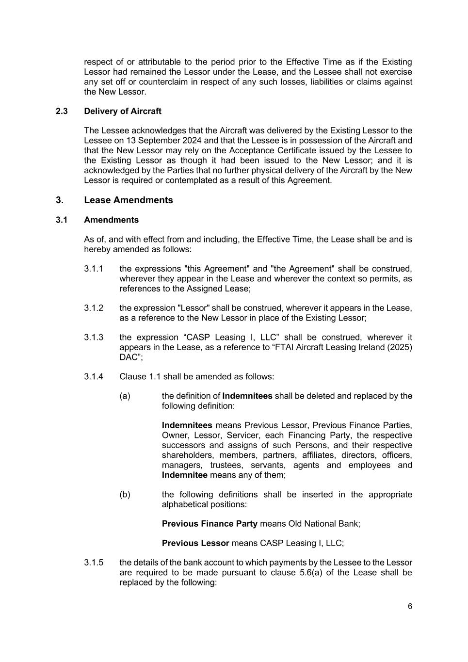6 respect of or attributable to the period prior to the Effective Time as if the Existing Lessor had remained the Lessor under the Lease, and the Lessee shall not exercise any set off or counterclaim in respect of any such losses, liabilities or claims against the New Lessor. 2.3 Delivery of Aircraft The Lessee acknowledges that the Aircraft was delivered by the Existing Lessor to the Lessee on 13 September 2024 and that the Lessee is in possession of the Aircraft and that the New Lessor may rely on the Acceptance Certificate issued by the Lessee to the Existing Lessor as though it had been issued to the New Lessor; and it is acknowledged by the Parties that no further physical delivery of the Aircraft by the New Lessor is required or contemplated as a result of this Agreement. 3. Lease Amendments 3.1 Amendments As of, and with effect from and including, the Effective Time, the Lease shall be and is hereby amended as follows: 3.1.1 the expressions "this Agreement" and "the Agreement" shall be construed, wherever they appear in the Lease and wherever the context so permits, as references to the Assigned Lease; 3.1.2 the expression "Lessor" shall be construed, wherever it appears in the Lease, as a reference to the New Lessor in place of the Existing Lessor; 3.1.3 the expression “CASP Leasing I, LLC” shall be construed, wherever it appears in the Lease, as a reference to “FTAI Aircraft Leasing Ireland (2025) DAC”; 3.1.4 Clause 1.1 shall be amended as follows: (a) the definition of Indemnitees shall be deleted and replaced by the following definition: Indemnitees means Previous Lessor, Previous Finance Parties, Owner, Lessor, Servicer, each Financing Party, the respective successors and assigns of such Persons, and their respective shareholders, members, partners, affiliates, directors, officers, managers, trustees, servants, agents and employees and Indemnitee means any of them; (b) the following definitions shall be inserted in the appropriate alphabetical positions: Previous Finance Party means Old National Bank; Previous Lessor means CASP Leasing I, LLC; 3.1.5 the details of the bank account to which payments by the Lessee to the Lessor are required to be made pursuant to clause 5.6(a) of the Lease shall be replaced by the following:
