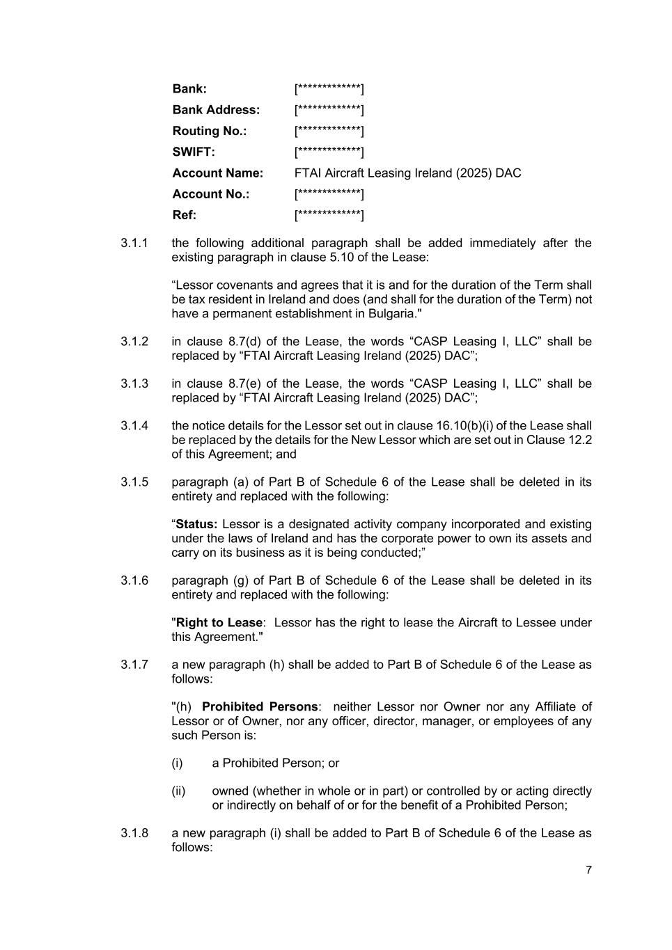 7 Bank: [*************] Bank Address: [*************] Routing No.: [*************] SWIFT: [*************] Account Name: FTAI Aircraft Leasing Ireland (2025) DAC Account No.: [*************] Ref: [*************] 3.1.1 the following additional paragraph shall be added immediately after the existing paragraph in clause 5.10 of the Lease: “Lessor covenants and agrees that it is and for the duration of the Term shall be tax resident in Ireland and does (and shall for the duration of the Term) not have a permanent establishment in Bulgaria." 3.1.2 in clause 8.7(d) of the Lease, the words “CASP Leasing I, LLC” shall be replaced by “FTAI Aircraft Leasing Ireland (2025) DAC”; 3.1.3 in clause 8.7(e) of the Lease, the words “CASP Leasing I, LLC” shall be replaced by “FTAI Aircraft Leasing Ireland (2025) DAC”; 3.1.4 the notice details for the Lessor set out in clause 16.10(b)(i) of the Lease shall be replaced by the details for the New Lessor which are set out in Clause 12.2 of this Agreement; and 3.1.5 paragraph (a) of Part B of Schedule 6 of the Lease shall be deleted in its entirety and replaced with the following: “Status: Lessor is a designated activity company incorporated and existing under the laws of Ireland and has the corporate power to own its assets and carry on its business as it is being conducted;” 3.1.6 paragraph (g) of Part B of Schedule 6 of the Lease shall be deleted in its entirety and replaced with the following: "Right to Lease: Lessor has the right to lease the Aircraft to Lessee under this Agreement." 3.1.7 a new paragraph (h) shall be added to Part B of Schedule 6 of the Lease as follows: "(h) Prohibited Persons: neither Lessor nor Owner nor any Affiliate of Lessor or of Owner, nor any officer, director, manager, or employees of any such Person is: (i) a Prohibited Person; or (ii) owned (whether in whole or in part) or controlled by or acting directly or indirectly on behalf of or for the benefit of a Prohibited Person; 3.1.8 a new paragraph (i) shall be added to Part B of Schedule 6 of the Lease as follows:
