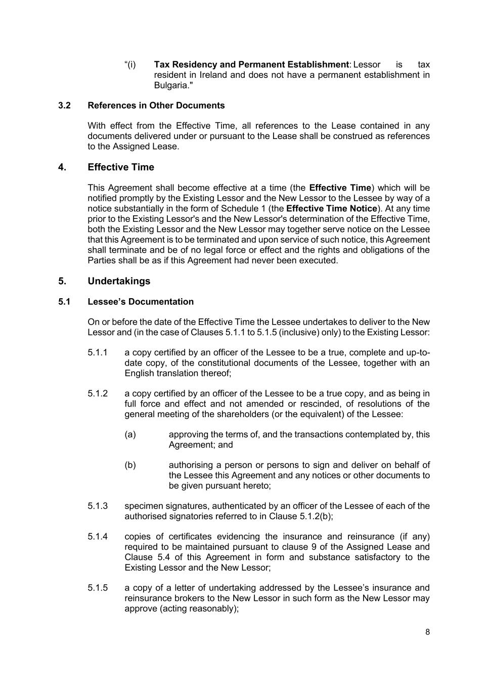 8 “(i) Tax Residency and Permanent Establishment: Lessor is tax resident in Ireland and does not have a permanent establishment in Bulgaria." 3.2 References in Other Documents With effect from the Effective Time, all references to the Lease contained in any documents delivered under or pursuant to the Lease shall be construed as references to the Assigned Lease. 4. Effective Time This Agreement shall become effective at a time (the Effective Time) which will be notified promptly by the Existing Lessor and the New Lessor to the Lessee by way of a notice substantially in the form of Schedule 1 (the Effective Time Notice). At any time prior to the Existing Lessor's and the New Lessor's determination of the Effective Time, both the Existing Lessor and the New Lessor may together serve notice on the Lessee that this Agreement is to be terminated and upon service of such notice, this Agreement shall terminate and be of no legal force or effect and the rights and obligations of the Parties shall be as if this Agreement had never been executed. 5. Undertakings 5.1 Lessee’s Documentation On or before the date of the Effective Time the Lessee undertakes to deliver to the New Lessor and (in the case of Clauses 5.1.1 to 5.1.5 (inclusive) only) to the Existing Lessor: 5.1.1 a copy certified by an officer of the Lessee to be a true, complete and up-to- date copy, of the constitutional documents of the Lessee, together with an English translation thereof; 5.1.2 a copy certified by an officer of the Lessee to be a true copy, and as being in full force and effect and not amended or rescinded, of resolutions of the general meeting of the shareholders (or the equivalent) of the Lessee: (a) approving the terms of, and the transactions contemplated by, this Agreement; and (b) authorising a person or persons to sign and deliver on behalf of the Lessee this Agreement and any notices or other documents to be given pursuant hereto; 5.1.3 specimen signatures, authenticated by an officer of the Lessee of each of the authorised signatories referred to in Clause 5.1.2(b); 5.1.4 copies of certificates evidencing the insurance and reinsurance (if any) required to be maintained pursuant to clause 9 of the Assigned Lease and Clause 5.4 of this Agreement in form and substance satisfactory to the Existing Lessor and the New Lessor; 5.1.5 a copy of a letter of undertaking addressed by the Lessee’s insurance and reinsurance brokers to the New Lessor in such form as the New Lessor may approve (acting reasonably);