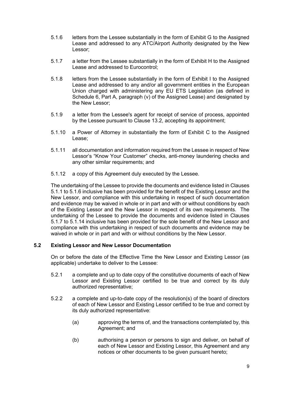 9 5.1.6 letters from the Lessee substantially in the form of Exhibit G to the Assigned Lease and addressed to any ATC/Airport Authority designated by the New Lessor; 5.1.7 a letter from the Lessee substantially in the form of Exhibit H to the Assigned Lease and addressed to Eurocontrol; 5.1.8 letters from the Lessee substantially in the form of Exhibit I to the Assigned Lease and addressed to any and/or all government entities in the European Union charged with administering any EU ETS Legislation (as defined in Schedule 6, Part A, paragraph (v) of the Assigned Lease) and designated by the New Lessor; 5.1.9 a letter from the Lessee's agent for receipt of service of process, appointed by the Lessee pursuant to Clause 13.2, accepting its appointment; 5.1.10 a Power of Attorney in substantially the form of Exhibit C to the Assigned Lease; 5.1.11 all documentation and information required from the Lessee in respect of New Lessor’s “Know Your Customer” checks, anti-money laundering checks and any other similar requirements; and 5.1.12 a copy of this Agreement duly executed by the Lessee. The undertaking of the Lessee to provide the documents and evidence listed in Clauses 5.1.1 to 5.1.6 inclusive has been provided for the benefit of the Existing Lessor and the New Lessor, and compliance with this undertaking in respect of such documentation and evidence may be waived in whole or in part and with or without conditions by each of the Existing Lessor and the New Lessor in respect of its own requirements. The undertaking of the Lessee to provide the documents and evidence listed in Clauses 5.1.7 to 5.1.14 inclusive has been provided for the sole benefit of the New Lessor and compliance with this undertaking in respect of such documents and evidence may be waived in whole or in part and with or without conditions by the New Lessor. 5.2 Existing Lessor and New Lessor Documentation On or before the date of the Effective Time the New Lessor and Existing Lessor (as applicable) undertake to deliver to the Lessee: 5.2.1 a complete and up to date copy of the constitutive documents of each of New Lessor and Existing Lessor certified to be true and correct by its duly authorized representative; 5.2.2 a complete and up-to-date copy of the resolution(s) of the board of directors of each of New Lessor and Existing Lessor certified to be true and correct by its duly authorized representative: (a) approving the terms of, and the transactions contemplated by, this Agreement; and (b) authorising a person or persons to sign and deliver, on behalf of each of New Lessor and Existing Lessor, this Agreement and any notices or other documents to be given pursuant hereto;