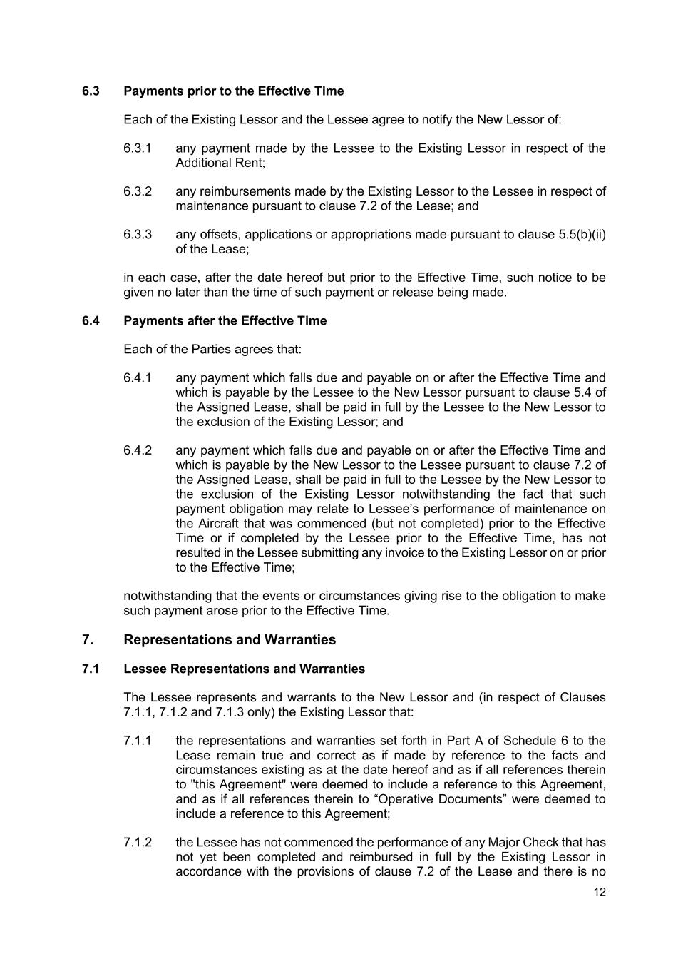 12 6.3 Payments prior to the Effective Time Each of the Existing Lessor and the Lessee agree to notify the New Lessor of: 6.3.1 any payment made by the Lessee to the Existing Lessor in respect of the Additional Rent; 6.3.2 any reimbursements made by the Existing Lessor to the Lessee in respect of maintenance pursuant to clause 7.2 of the Lease; and 6.3.3 any offsets, applications or appropriations made pursuant to clause 5.5(b)(ii) of the Lease; in each case, after the date hereof but prior to the Effective Time, such notice to be given no later than the time of such payment or release being made. 6.4 Payments after the Effective Time Each of the Parties agrees that: 6.4.1 any payment which falls due and payable on or after the Effective Time and which is payable by the Lessee to the New Lessor pursuant to clause 5.4 of the Assigned Lease, shall be paid in full by the Lessee to the New Lessor to the exclusion of the Existing Lessor; and 6.4.2 any payment which falls due and payable on or after the Effective Time and which is payable by the New Lessor to the Lessee pursuant to clause 7.2 of the Assigned Lease, shall be paid in full to the Lessee by the New Lessor to the exclusion of the Existing Lessor notwithstanding the fact that such payment obligation may relate to Lessee’s performance of maintenance on the Aircraft that was commenced (but not completed) prior to the Effective Time or if completed by the Lessee prior to the Effective Time, has not resulted in the Lessee submitting any invoice to the Existing Lessor on or prior to the Effective Time; notwithstanding that the events or circumstances giving rise to the obligation to make such payment arose prior to the Effective Time. 7. Representations and Warranties 7.1 Lessee Representations and Warranties The Lessee represents and warrants to the New Lessor and (in respect of Clauses 7.1.1, 7.1.2 and 7.1.3 only) the Existing Lessor that: 7.1.1 the representations and warranties set forth in Part A of Schedule 6 to the Lease remain true and correct as if made by reference to the facts and circumstances existing as at the date hereof and as if all references therein to "this Agreement" were deemed to include a reference to this Agreement, and as if all references therein to “Operative Documents” were deemed to include a reference to this Agreement; 7.1.2 the Lessee has not commenced the performance of any Major Check that has not yet been completed and reimbursed in full by the Existing Lessor in accordance with the provisions of clause 7.2 of the Lease and there is no
