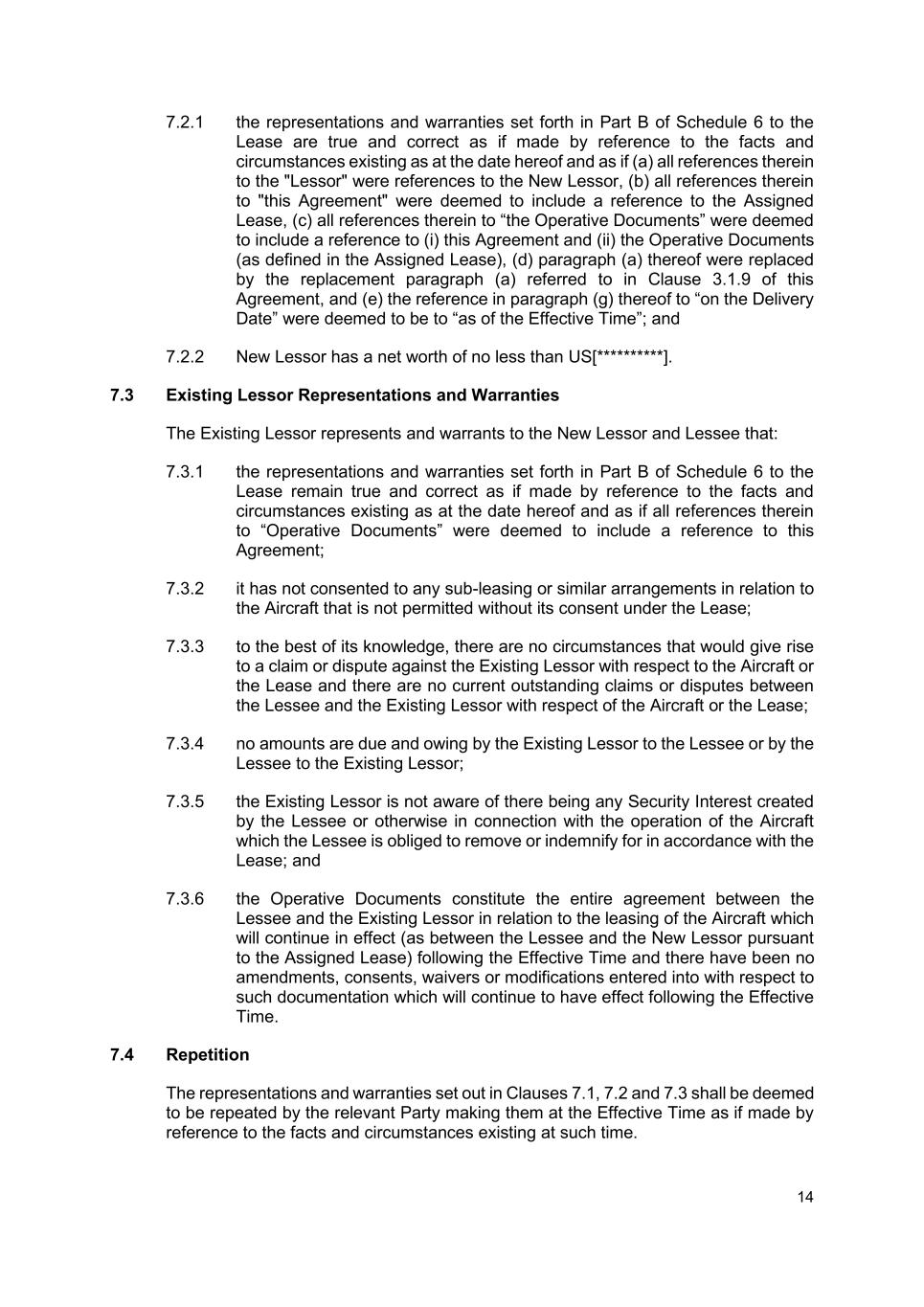 14 7.2.1 the representations and warranties set forth in Part B of Schedule 6 to the Lease are true and correct as if made by reference to the facts and circumstances existing as at the date hereof and as if (a) all references therein to the "Lessor" were references to the New Lessor, (b) all references therein to "this Agreement" were deemed to include a reference to the Assigned Lease, (c) all references therein to “the Operative Documents” were deemed to include a reference to (i) this Agreement and (ii) the Operative Documents (as defined in the Assigned Lease), (d) paragraph (a) thereof were replaced by the replacement paragraph (a) referred to in Clause 3.1.9 of this Agreement, and (e) the reference in paragraph (g) thereof to “on the Delivery Date” were deemed to be to “as of the Effective Time”; and 7.2.2 New Lessor has a net worth of no less than US[**********]. 7.3 Existing Lessor Representations and Warranties The Existing Lessor represents and warrants to the New Lessor and Lessee that: 7.3.1 the representations and warranties set forth in Part B of Schedule 6 to the Lease remain true and correct as if made by reference to the facts and circumstances existing as at the date hereof and as if all references therein to “Operative Documents” were deemed to include a reference to this Agreement; 7.3.2 it has not consented to any sub-leasing or similar arrangements in relation to the Aircraft that is not permitted without its consent under the Lease; 7.3.3 to the best of its knowledge, there are no circumstances that would give rise to a claim or dispute against the Existing Lessor with respect to the Aircraft or the Lease and there are no current outstanding claims or disputes between the Lessee and the Existing Lessor with respect of the Aircraft or the Lease; 7.3.4 no amounts are due and owing by the Existing Lessor to the Lessee or by the Lessee to the Existing Lessor; 7.3.5 the Existing Lessor is not aware of there being any Security Interest created by the Lessee or otherwise in connection with the operation of the Aircraft which the Lessee is obliged to remove or indemnify for in accordance with the Lease; and 7.3.6 the Operative Documents constitute the entire agreement between the Lessee and the Existing Lessor in relation to the leasing of the Aircraft which will continue in effect (as between the Lessee and the New Lessor pursuant to the Assigned Lease) following the Effective Time and there have been no amendments, consents, waivers or modifications entered into with respect to such documentation which will continue to have effect following the Effective Time. 7.4 Repetition The representations and warranties set out in Clauses 7.1, 7.2 and 7.3 shall be deemed to be repeated by the relevant Party making them at the Effective Time as if made by reference to the facts and circumstances existing at such time.