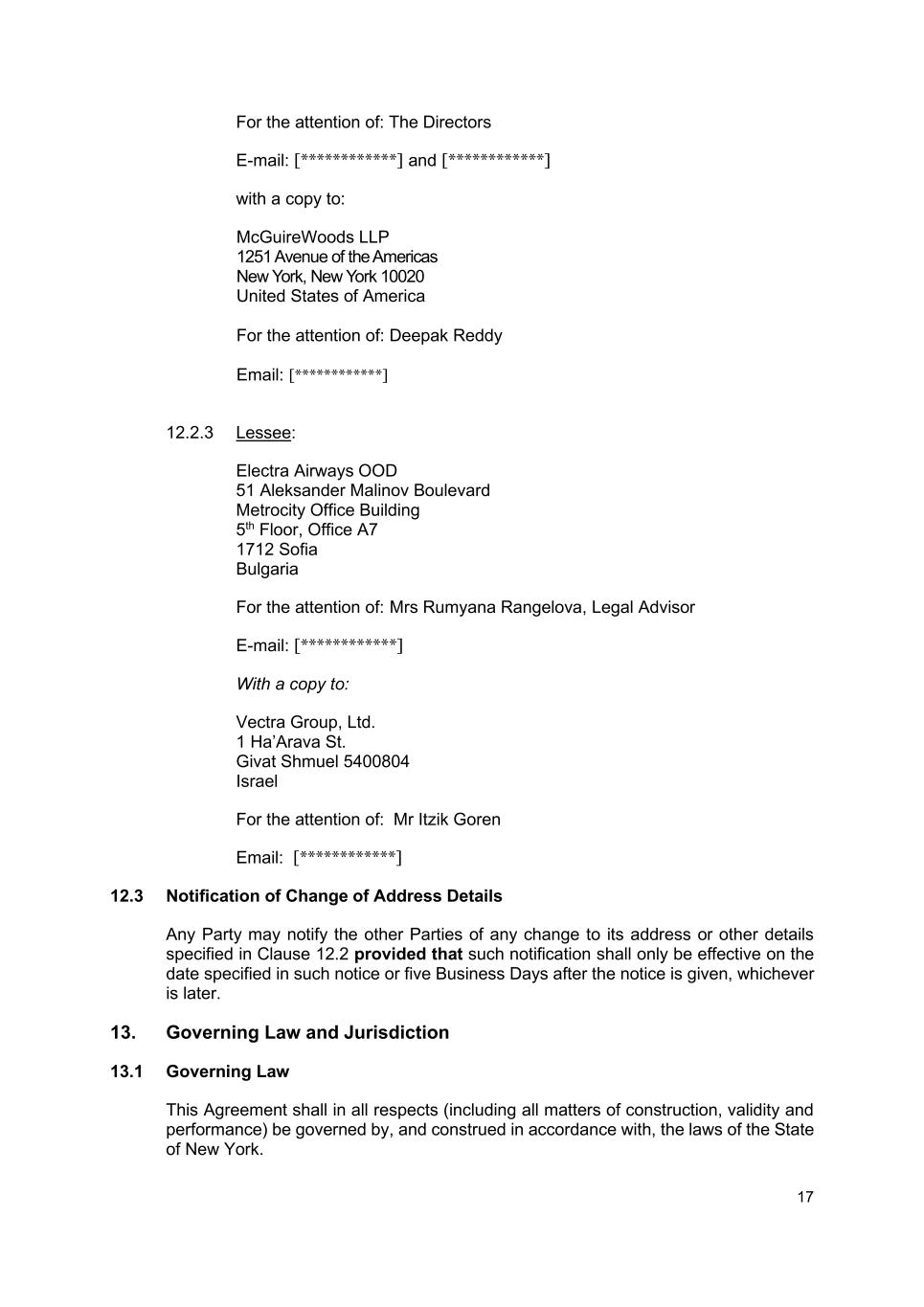 17 For the attention of: The Directors E-mail: [************] and [************] with a copy to: McGuireWoods LLP 1251 Avenue of the Americas New York, New York 10020 United States of America For the attention of: Deepak Reddy Email: [************] 12.2.3 Lessee: Electra Airways OOD 51 Aleksander Malinov Boulevard Metrocity Office Building 5th Floor, Office A7 1712 Sofia Bulgaria For the attention of: Mrs Rumyana Rangelova, Legal Advisor E-mail: [************] With a copy to: Vectra Group, Ltd. 1 Ha’Arava St. Givat Shmuel 5400804 Israel For the attention of: Mr Itzik Goren Email: [************] 12.3 Notification of Change of Address Details Any Party may notify the other Parties of any change to its address or other details specified in Clause 12.2 provided that such notification shall only be effective on the date specified in such notice or five Business Days after the notice is given, whichever is later. 13. Governing Law and Jurisdiction 13.1 Governing Law This Agreement shall in all respects (including all matters of construction, validity and performance) be governed by, and construed in accordance with, the laws of the State of New York.