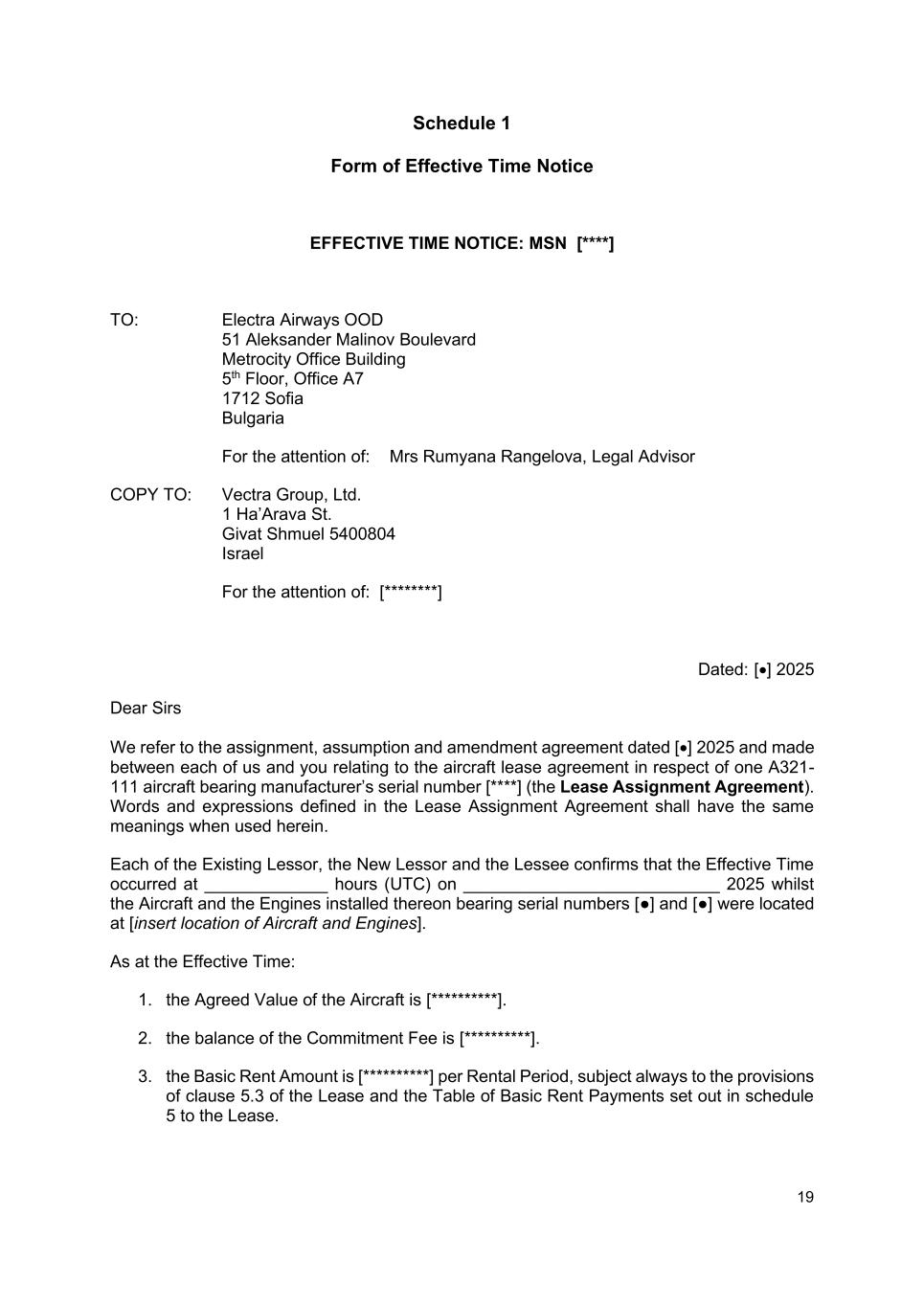19 Schedule 1 Form of Effective Time Notice EFFECTIVE TIME NOTICE: MSN [****] TO: Electra Airways OOD 51 Aleksander Malinov Boulevard Metrocity Office Building 5th Floor, Office A7 1712 Sofia Bulgaria For the attention of: Mrs Rumyana Rangelova, Legal Advisor COPY TO: Vectra Group, Ltd. 1 Ha’Arava St. Givat Shmuel 5400804 Israel For the attention of: [********] Dated: [•] 2025 Dear Sirs We refer to the assignment, assumption and amendment agreement dated [•] 2025 and made between each of us and you relating to the aircraft lease agreement in respect of one A321- 111 aircraft bearing manufacturer’s serial number [****] (the Lease Assignment Agreement). Words and expressions defined in the Lease Assignment Agreement shall have the same meanings when used herein. Each of the Existing Lessor, the New Lessor and the Lessee confirms that the Effective Time occurred at _____________ hours (UTC) on ___________________________ 2025 whilst the Aircraft and the Engines installed thereon bearing serial numbers [●] and [●] were located at [insert location of Aircraft and Engines]. As at the Effective Time: 1. the Agreed Value of the Aircraft is [**********]. 2. the balance of the Commitment Fee is [**********]. 3. the Basic Rent Amount is [**********] per Rental Period, subject always to the provisions of clause 5.3 of the Lease and the Table of Basic Rent Payments set out in schedule 5 to the Lease.