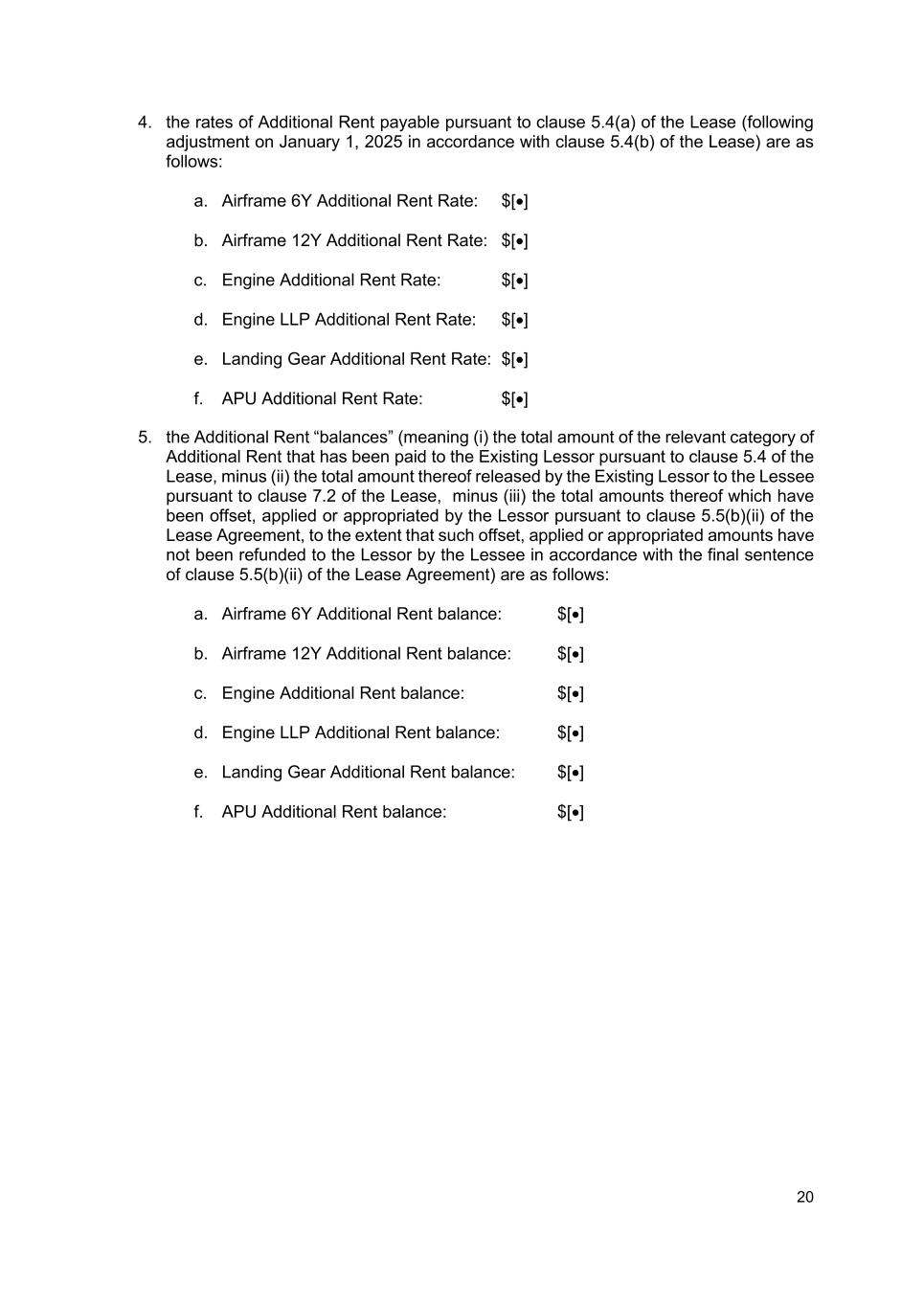 20 4. the rates of Additional Rent payable pursuant to clause 5.4(a) of the Lease (following adjustment on January 1, 2025 in accordance with clause 5.4(b) of the Lease) are as follows: a. Airframe 6Y Additional Rent Rate: $[•] b. Airframe 12Y Additional Rent Rate: $[•] c. Engine Additional Rent Rate: $[•] d. Engine LLP Additional Rent Rate: $[•] e. Landing Gear Additional Rent Rate: $[•] f. APU Additional Rent Rate: $[•] 5. the Additional Rent “balances” (meaning (i) the total amount of the relevant category of Additional Rent that has been paid to the Existing Lessor pursuant to clause 5.4 of the Lease, minus (ii) the total amount thereof released by the Existing Lessor to the Lessee pursuant to clause 7.2 of the Lease, minus (iii) the total amounts thereof which have been offset, applied or appropriated by the Lessor pursuant to clause 5.5(b)(ii) of the Lease Agreement, to the extent that such offset, applied or appropriated amounts have not been refunded to the Lessor by the Lessee in accordance with the final sentence of clause 5.5(b)(ii) of the Lease Agreement) are as follows: a. Airframe 6Y Additional Rent balance: $[•] b. Airframe 12Y Additional Rent balance: $[•] c. Engine Additional Rent balance: $[•] d. Engine LLP Additional Rent balance: $[•] e. Landing Gear Additional Rent balance: $[•] f. APU Additional Rent balance: $[•]