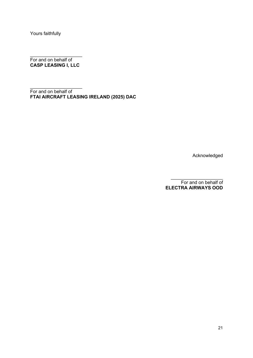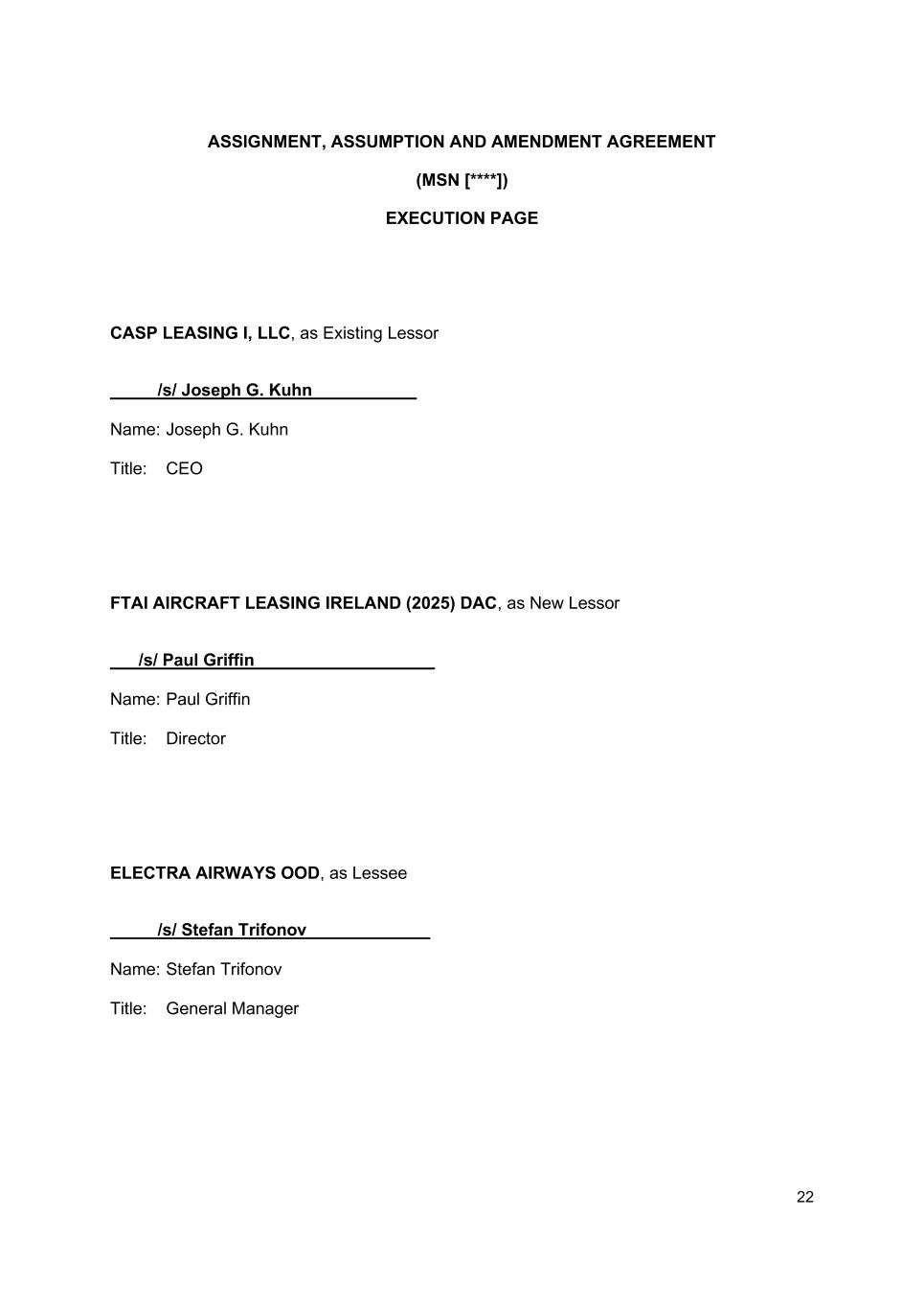 21 Yours faithfully ____________________ For and on behalf of CASP LEASING I, LLC ____________________ For and on behalf of FTAI AIRCRAFT LEASING IRELAND (2025) DAC Acknowledged ____________________ For and on behalf of ELECTRA AIRWAYS OOD
