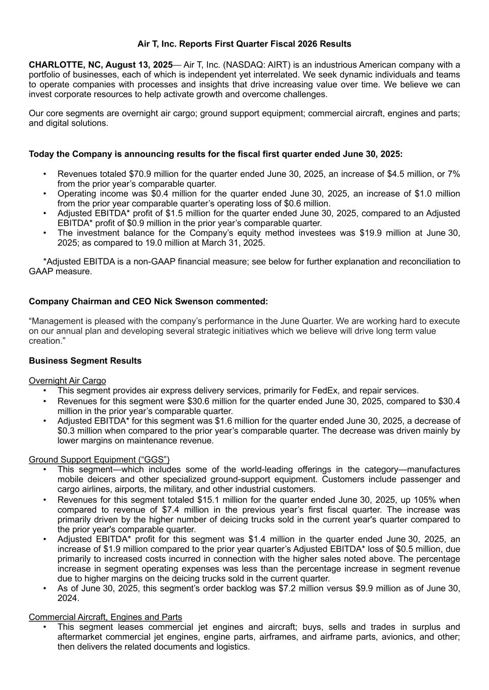 Air T, Inc. Reports First Quarter Fiscal 2026 Results CHARLOTTE, NC, August 13, 2025— Air T, Inc. (NASDAQ: AIRT) is an industrious American company with a portfolio of businesses, each of which is independent yet interrelated. We seek dynamic individuals and teams to operate companies with processes and insights that drive increasing value over time. We believe we can invest corporate resources to help activate growth and overcome challenges. Our core segments are overnight air cargo; ground support equipment; commercial aircraft, engines and parts; and digital solutions. Today the Company is announcing results for the fiscal first quarter ended June 30, 2025: • Revenues totaled $70.9 million for the quarter ended June 30, 2025, an increase of $4.5 million, or 7% from the prior year’s comparable quarter. • Operating income was $0.4 million for the quarter ended June 30, 2025, an increase of $1.0 million from the prior year comparable quarter’s operating loss of $0.6 million. • Adjusted EBITDA* profit of $1.5 million for the quarter ended June 30, 2025, compared to an Adjusted EBITDA* profit of $0.9 million in the prior year’s comparable quarter. • The investment balance for the Company’s equity method investees was $19.9 million at June 30, 2025; as compared to 19.0 million at March 31, 2025. *Adjusted EBITDA is a non-GAAP financial measure; see below for further explanation and reconciliation to GAAP measure. Company Chairman and CEO Nick Swenson commented: “Management is pleased with the company’s performance in the June Quarter. We are working hard to execute on our annual plan and developing several strategic initiatives which we believe will drive long term value creation.” Business Segment Results Overnight Air Cargo • This segment provides air express delivery services, primarily for FedEx, and repair services. • Revenues for this segment were $30.6 million for the quarter ended June 30, 2025, compared to $30.4 million in the prior year’s comparable quarter. • Adjusted EBITDA* for this segment was $1.6 million for the quarter ended June 30, 2025, a decrease of $0.3 million when compared to the prior year’s comparable quarter. The decrease was driven mainly by lower margins on maintenance revenue. Ground Support Equipment (“GGS”) • This segment—which includes some of the world-leading offerings in the category—manufactures mobile deicers and other specialized ground-support equipment. Customers include passenger and cargo airlines, airports, the military, and other industrial customers. • Revenues for this segment totaled $15.1 million for the quarter ended June 30, 2025, up 105% when compared to revenue of $7.4 million in the previous year’s first fiscal quarter. The increase was primarily driven by the higher number of deicing trucks sold in the current year's quarter compared to the prior year's comparable quarter. • Adjusted EBITDA* profit for this segment was $1.4 million in the quarter ended June 30, 2025, an increase of $1.9 million compared to the prior year quarter’s Adjusted EBITDA* loss of $0.5 million, due primarily to increased costs incurred in connection with the higher sales noted above. The percentage increase in segment operating expenses was less than the percentage increase in segment revenue due to higher margins on the deicing trucks sold in the current quarter. • As of June 30, 2025, this segment’s order backlog was $7.2 million versus $9.9 million as of June 30, 2024. Commercial Aircraft, Engines and Parts • This segment leases commercial jet engines and aircraft; buys, sells and trades in surplus and aftermarket commercial jet engines, engine parts, airframes, and airframe parts, avionics, and other; then delivers the related documents and logistics.